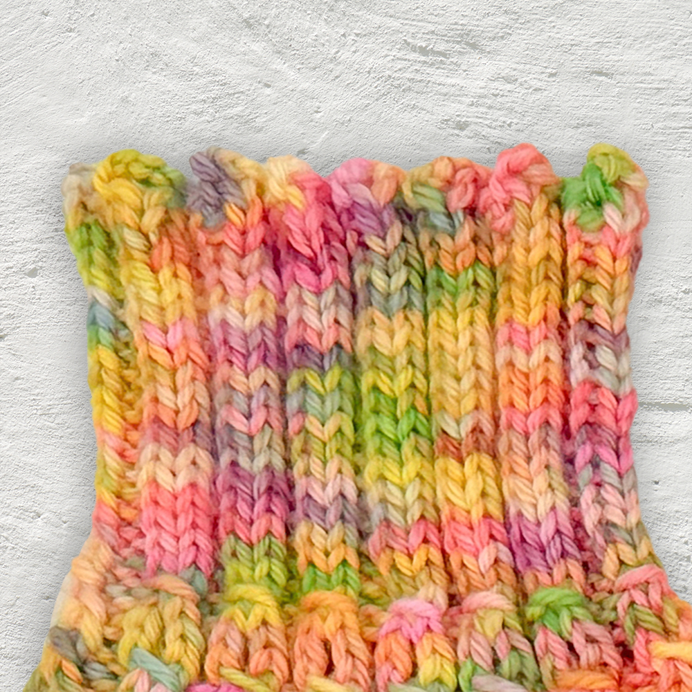 Zum Stricken von echten Mausezähnchen bin ich immer zu faul; mir wird der Bund dabei allerdings auch zu dick. Die gepfuschten Mausezähnchen gehen schnell und sehen hübsch aus; sie sind allerdings nur für 2:2er-Bündchen geeignet. Man kann sie natürlich nicht nur an Socken stricken, sondern im Grunde an allen Strickstücken, die mit 2:2er-Rippen starten. Aber an Socken mag ich sie am liebsten.