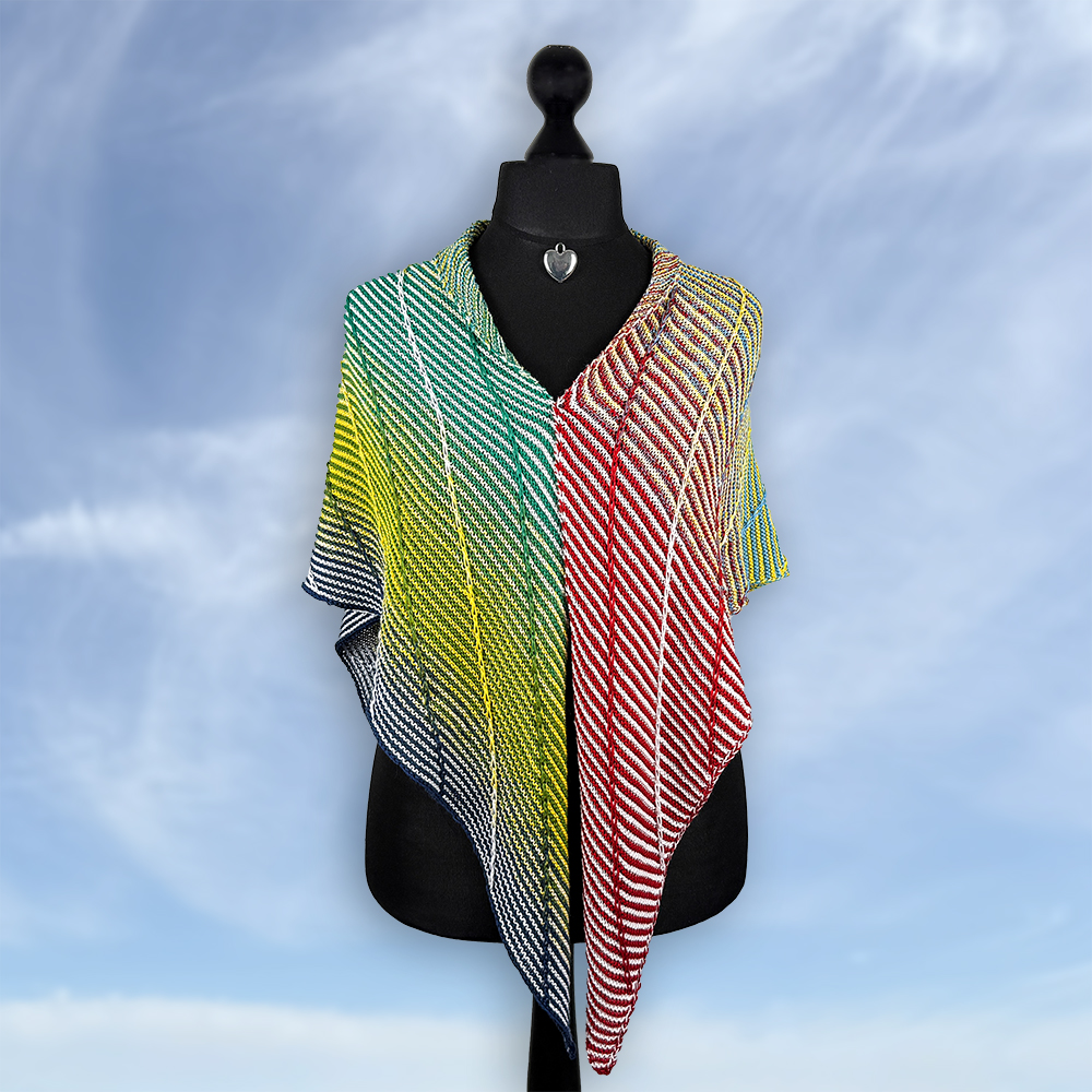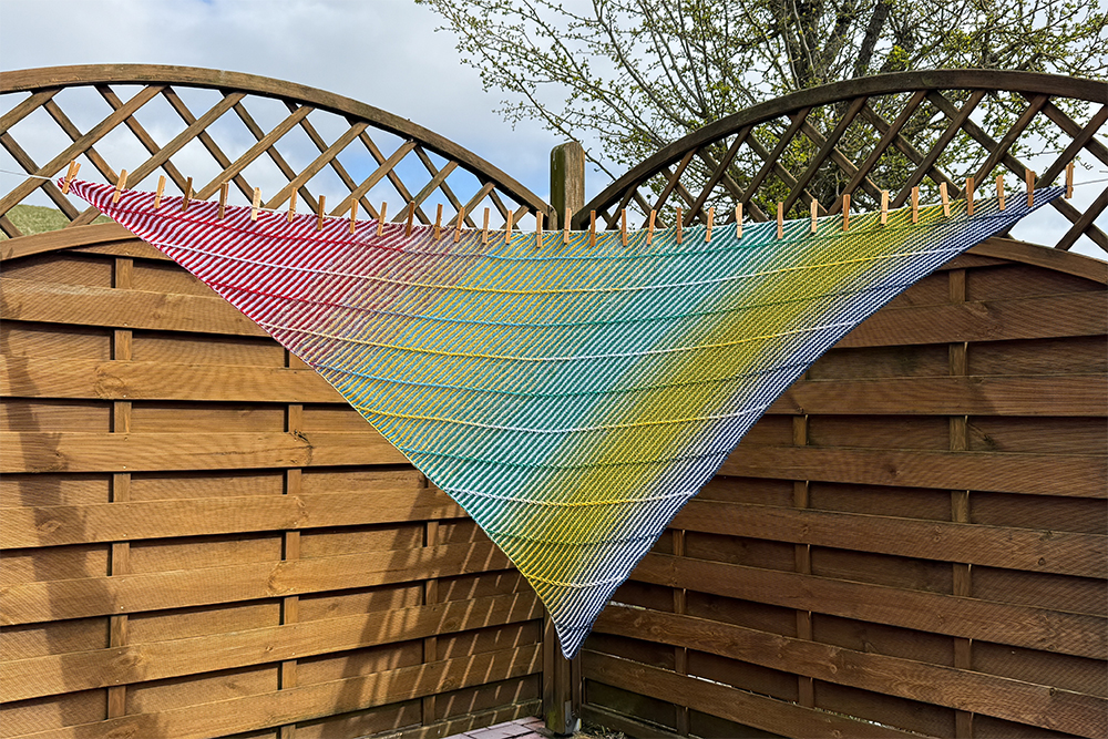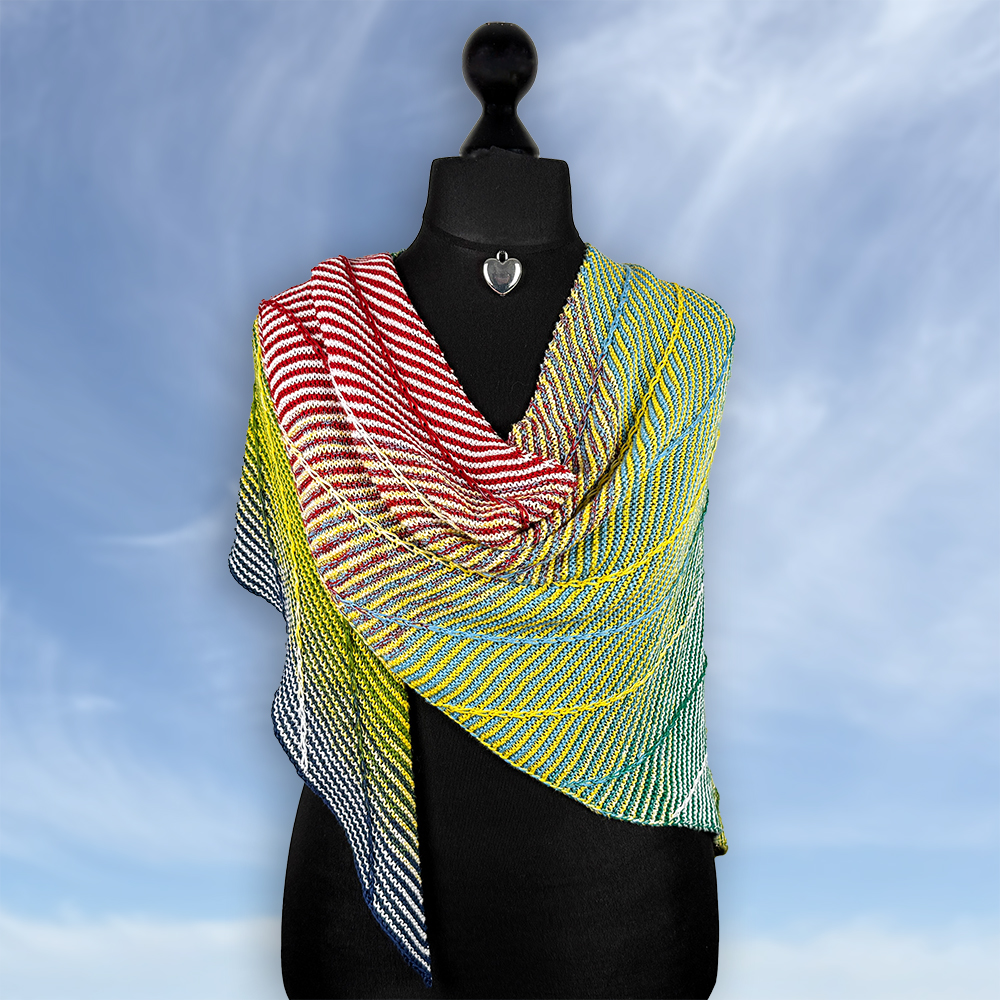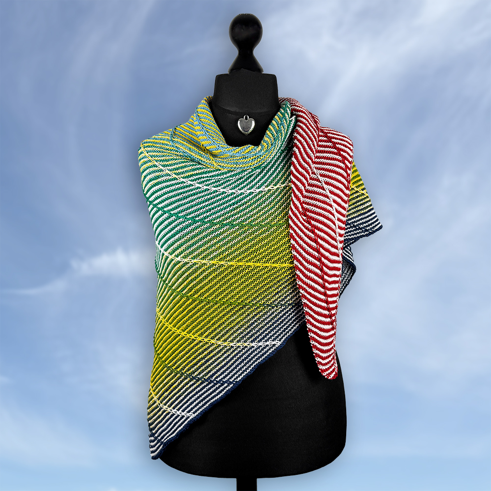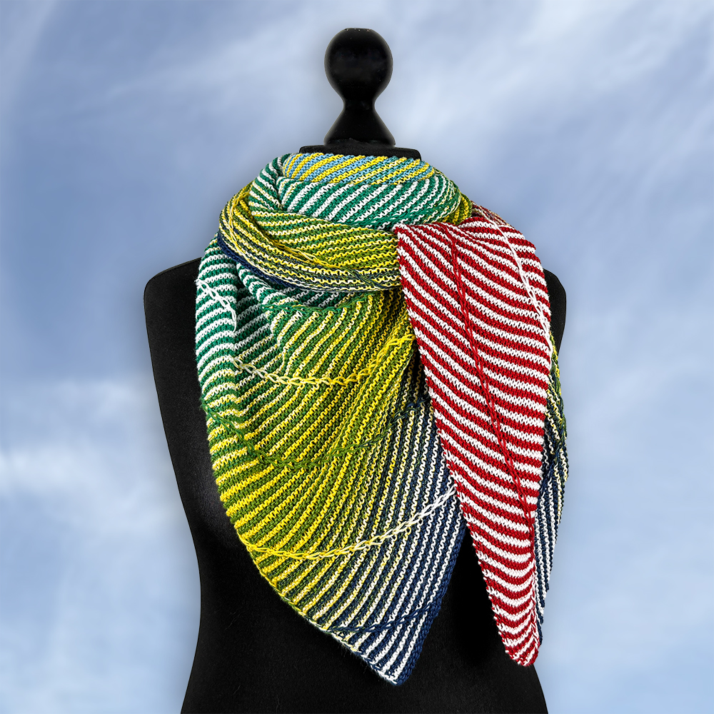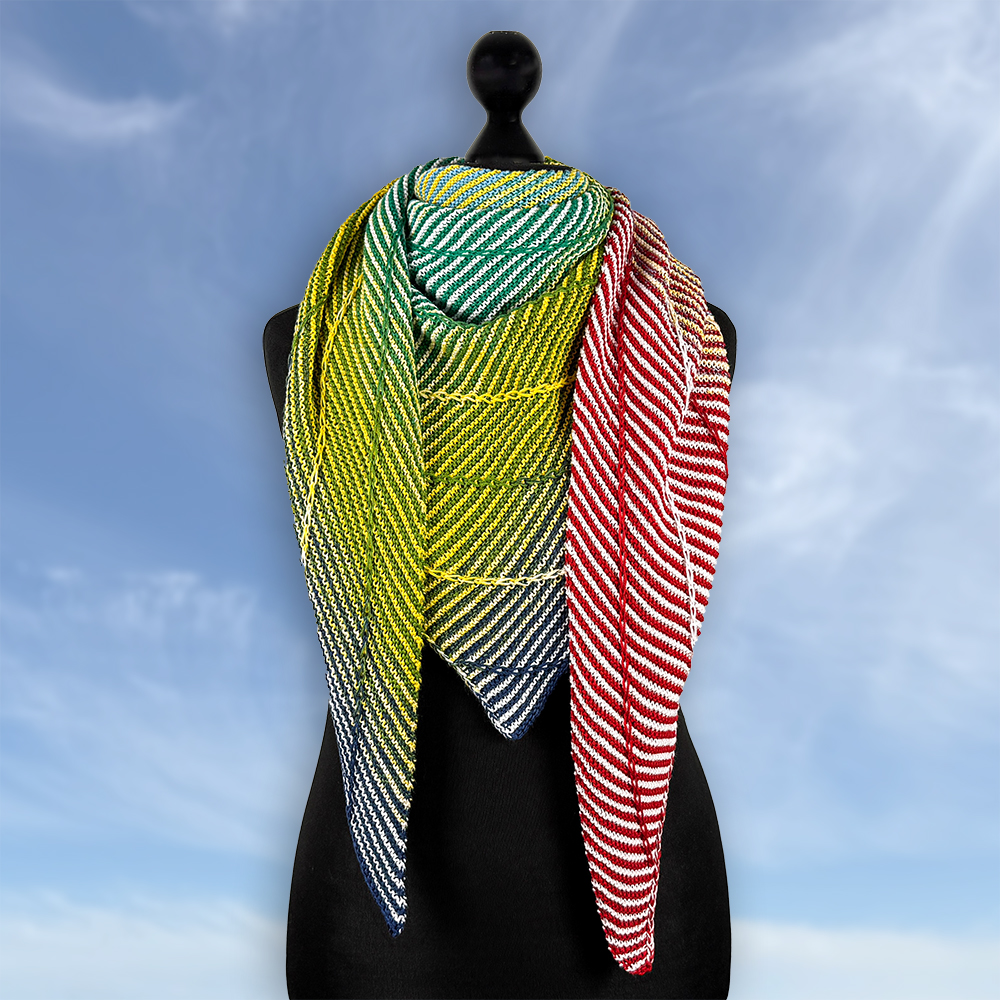 Da ich kein Tuch zweimal stricke, musste ich mir für diesen Leuchti ein neues Muster überlegen und bin auf schräg gestrickte Hebemaschen gekommen. Mein Tutorial-Video, wie das geht, verlinke ich Euch unter den Bildern.