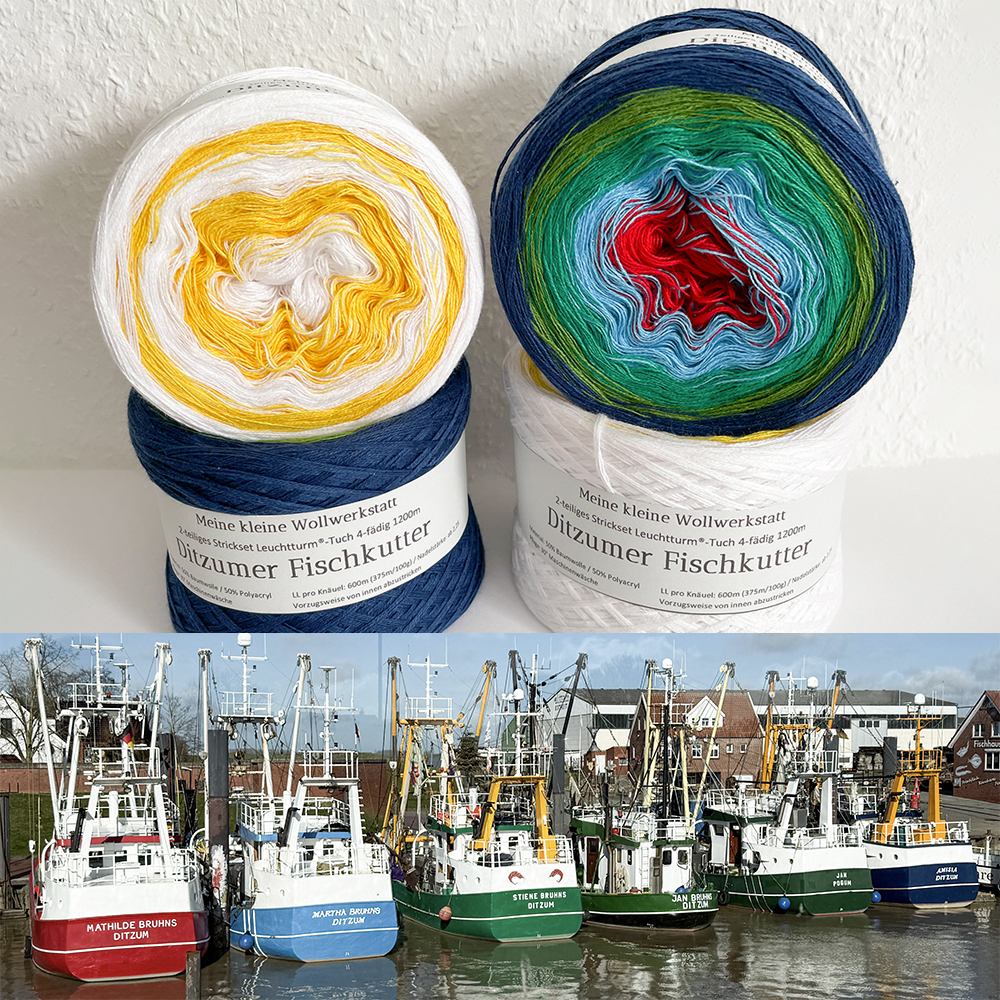 Die Wicklung ‚Ditzumer Fischkutter‘ nach den Fischkuttern in unserem kleinen Hafen war meine allererste Wunschwicklung und ich mag sie immer noch. Sie ist aber keine Wunschwicklung geblieben, sondern man kann sie seit über drei Jahren bei den Leuchti-Wicklerinnen in den Shops kaufen, worauf ich sehr stolz bin. Die Bobbel für meinen vierten Fischkutter-Leuchti hat wie immer Maike von Meine kleine Wollwerkstatt wunderbar gewickelt, vielen lieben Dank dafür.