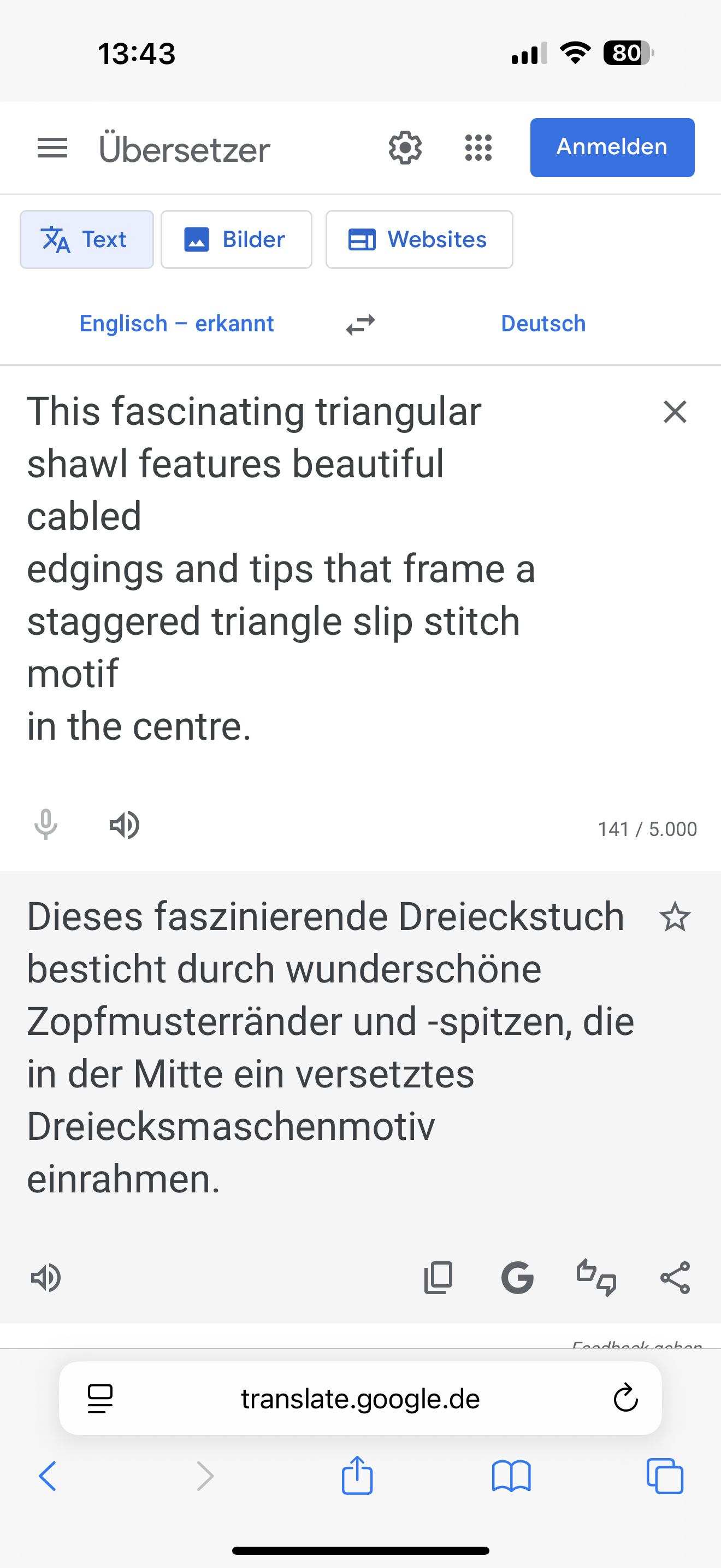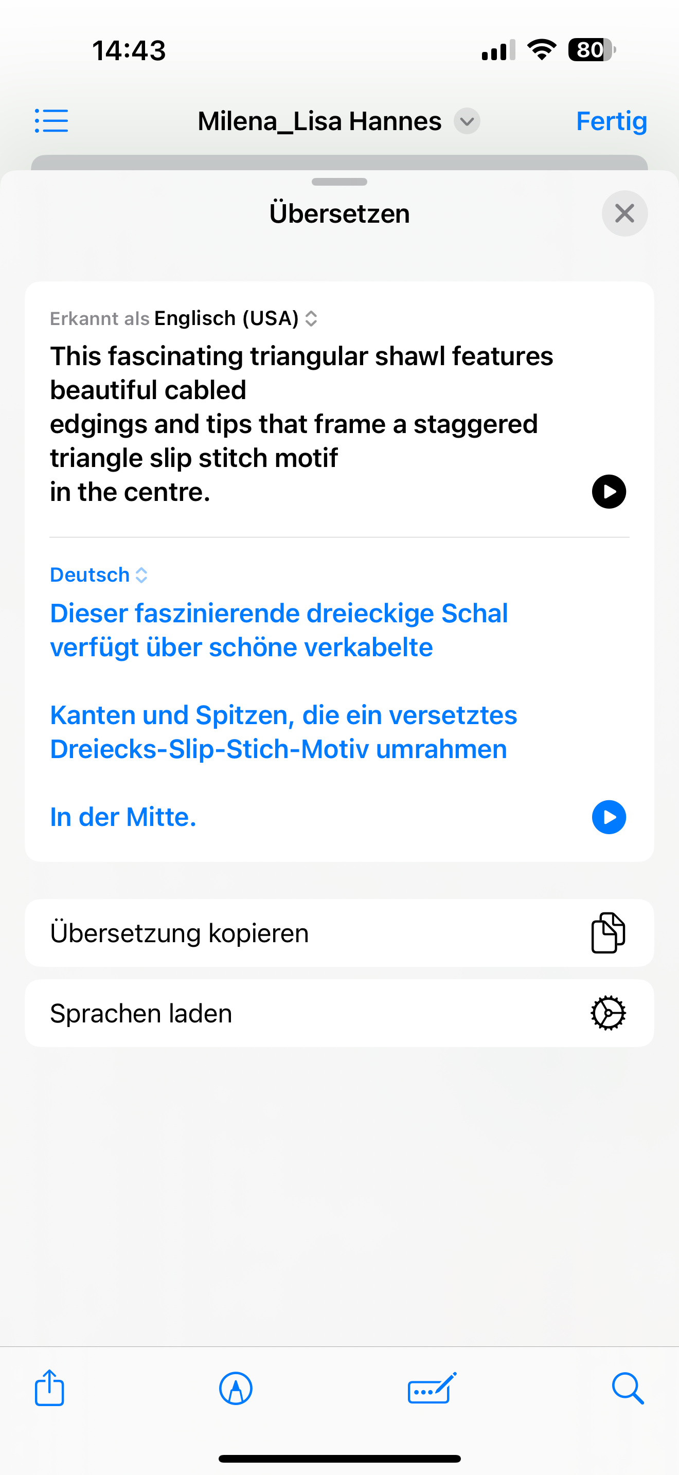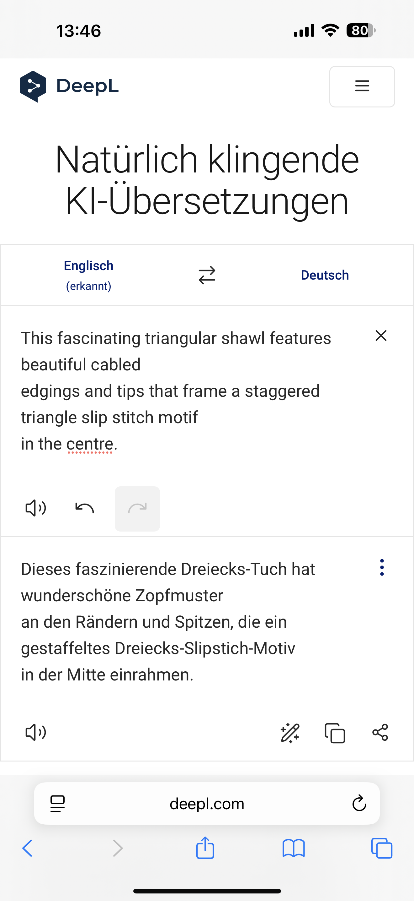 So arbeite ich mich Stück für Stück durch die ausgeschriebenen Texte der Anleitung, also all das, was nicht direkt die Anweisungen, wie man stricken muss, betrifft. Oft speichere ich mir die Übersetzungen in einem neuen Dokument ab, damit ich sie nicht immer wieder nachgucken muss. Was ich bei Apple festgestellt habe ist, dass Übersetzungen besser klappen, wenn man nicht direkt den ganzen Text übersetzen lässt, sondern wirklich Stück für Stück vorgeht. Wie das bei Google und Deepl ist, kann ich nicht wirklich beurteilen, weil ich diese beiden Programme so gut wie nicht brauche.