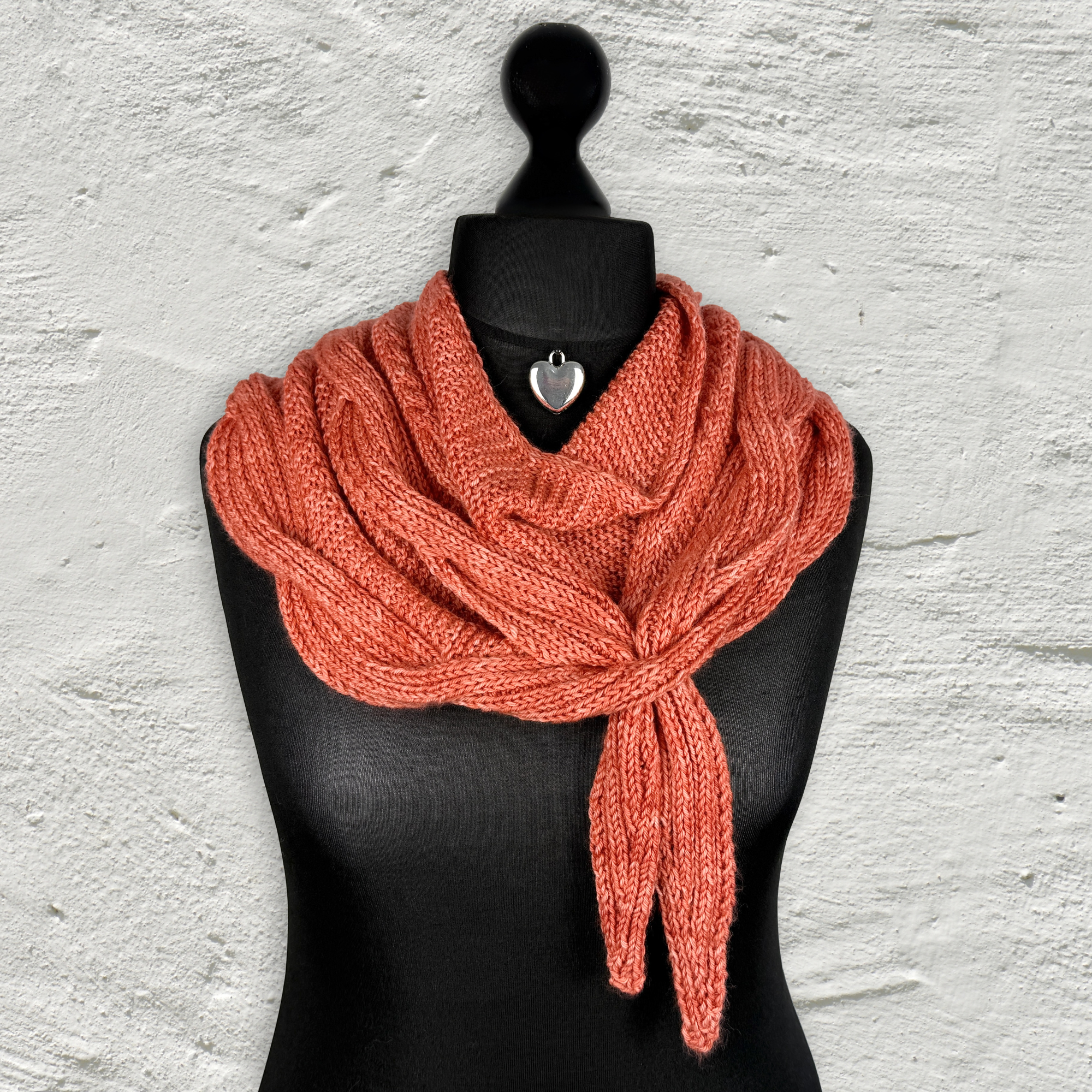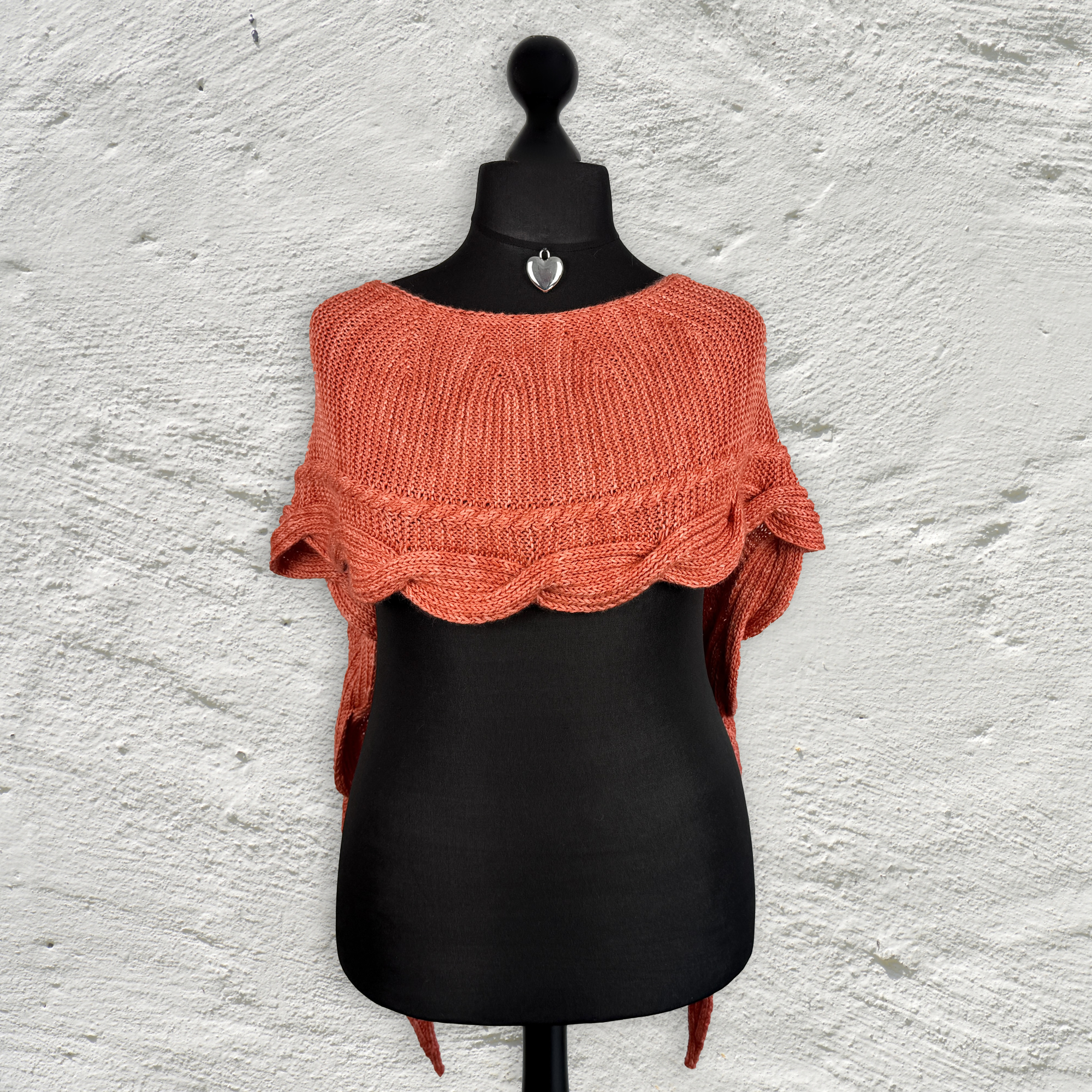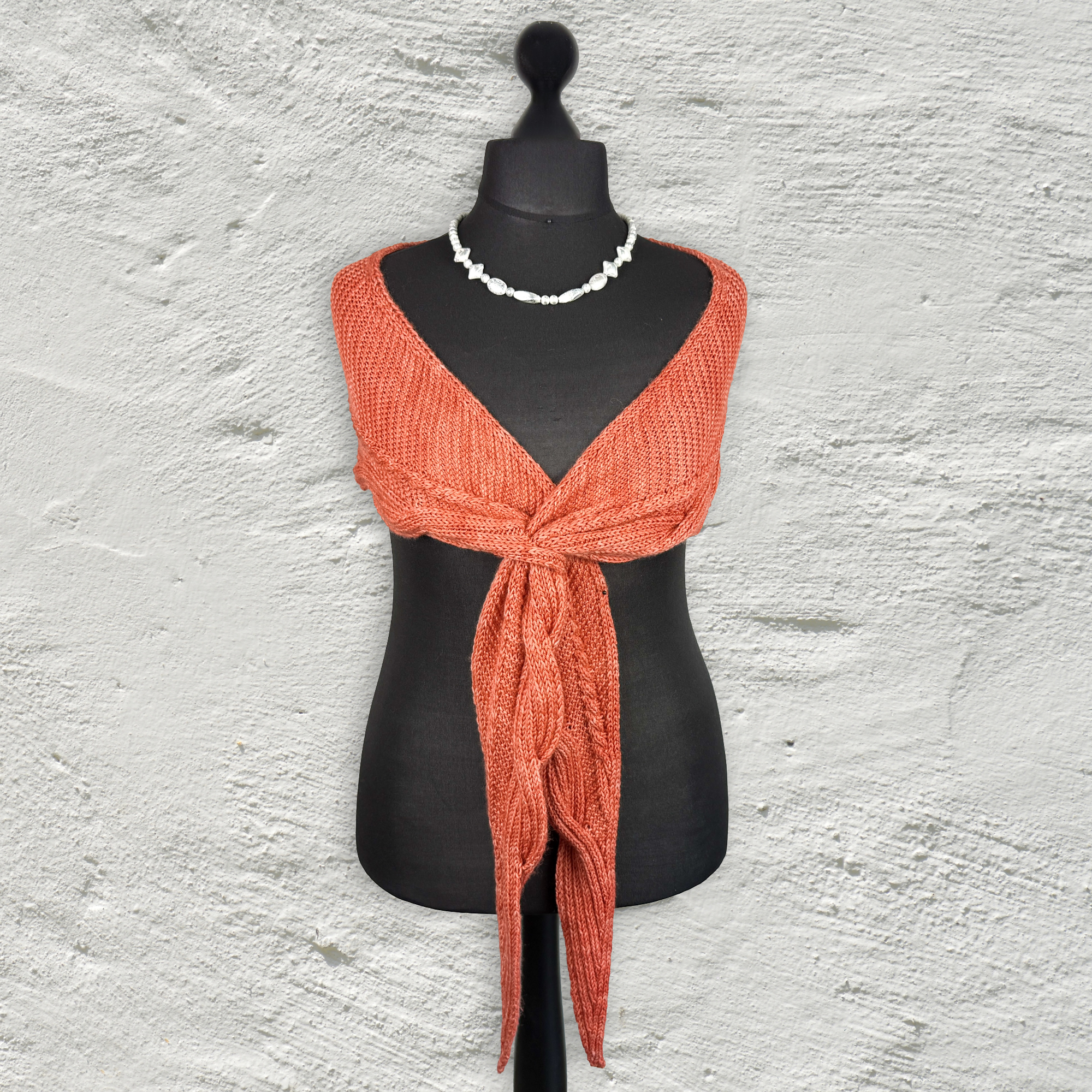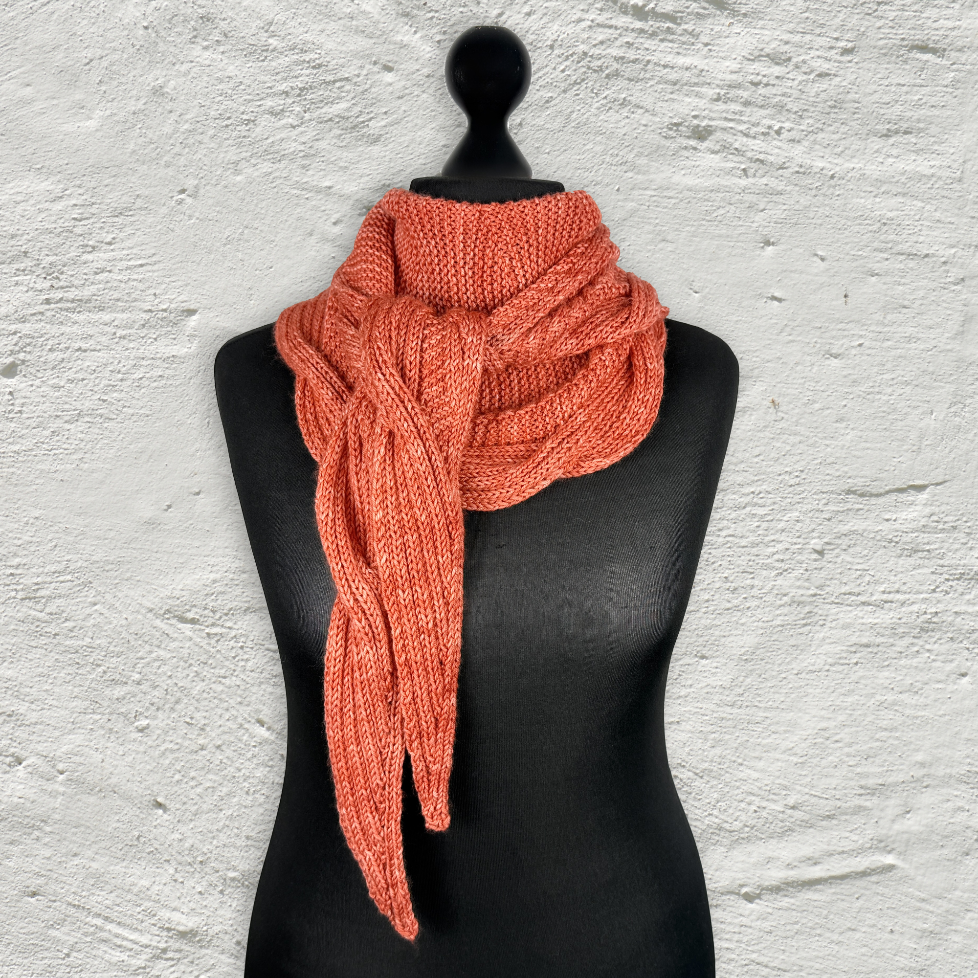 Das Tolle an diesem Schal ist, dass die Zöpfe mit 2re2li-Rippen gestrickt werden, was den Vorteil hat, dass sie sowohl auf der Vorder- als auch auf der Rückseite des Schals sichtbar sind. Da der Rest des Tuches kraus gestrickt ist, gibt es so keine linke Seite; der Schal ist von beiden Seiten gleich. Und ich mag, dass man die Zwischenräume, die beim Kreuzen der 24er-Zöpfe entstehen, wie ein Knopfloch, nur eben nicht für Knöpfe, sondern die Tuchzipfel benutzen kann.