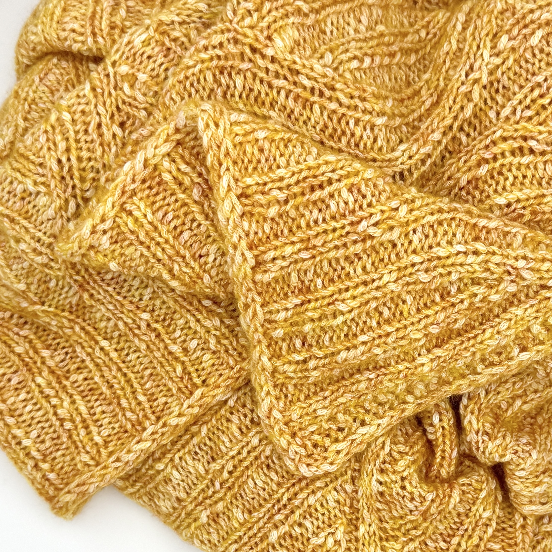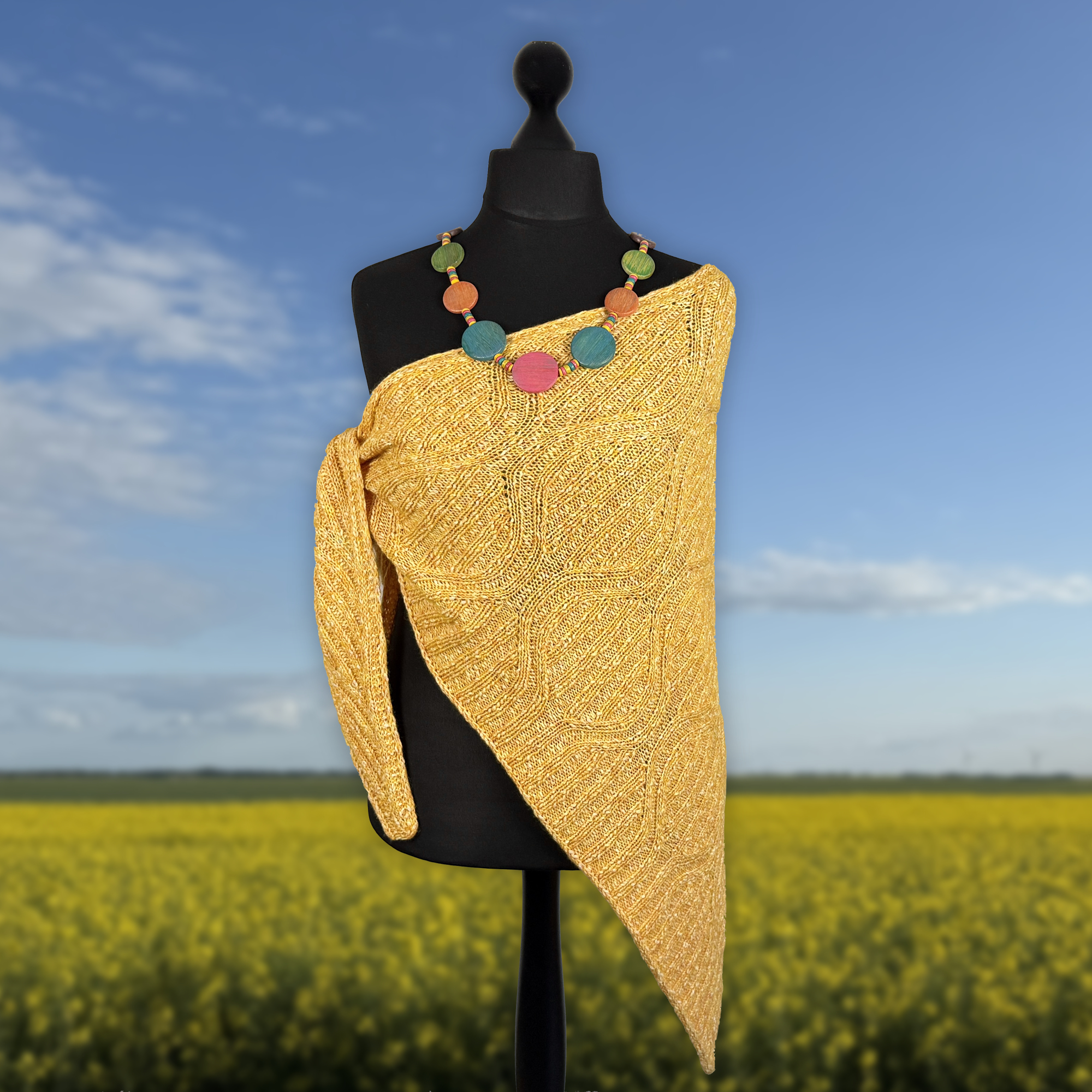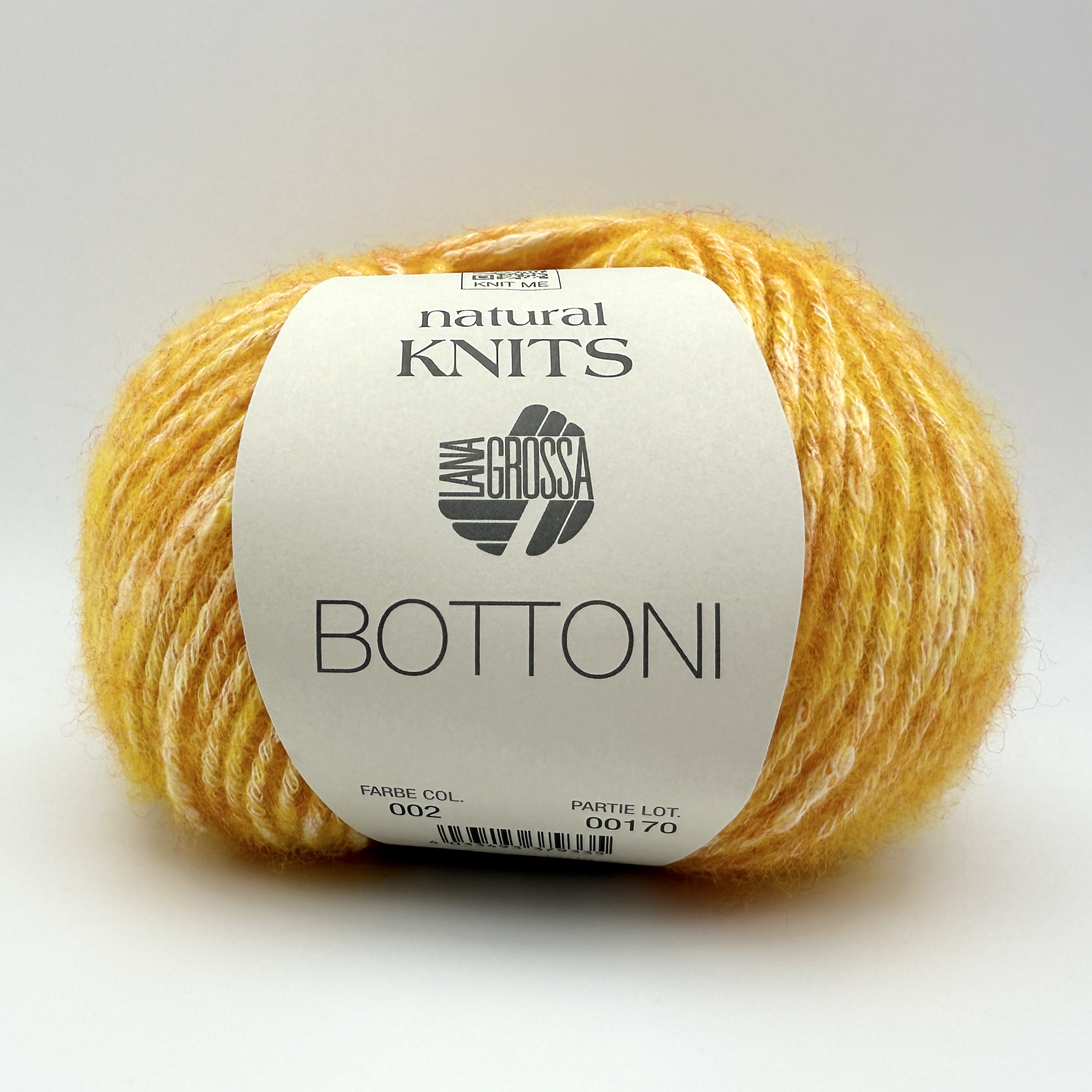 Für den Shawl hatte ich mir wieder ein Garn mit ordentlich Baumwolle ausgesucht; ich mag Baumwolle in Tüchern einfach ausgesprochen gerne. Die Muster werden damit schön plastisch und die Tücher fallen gut. Ich hatte mich für Bottoni von Lana Grossa in der Farbe 02 (Gelb/Orange/Creme) entschieden, ein leicht unregelmäßiges Schlauchgarn mit 53% Baumwolle, 24% Viskose und 23% Merino. Es ist etwas dicker, aber wunderbar weich und leicht und strickt sich sehr gut.