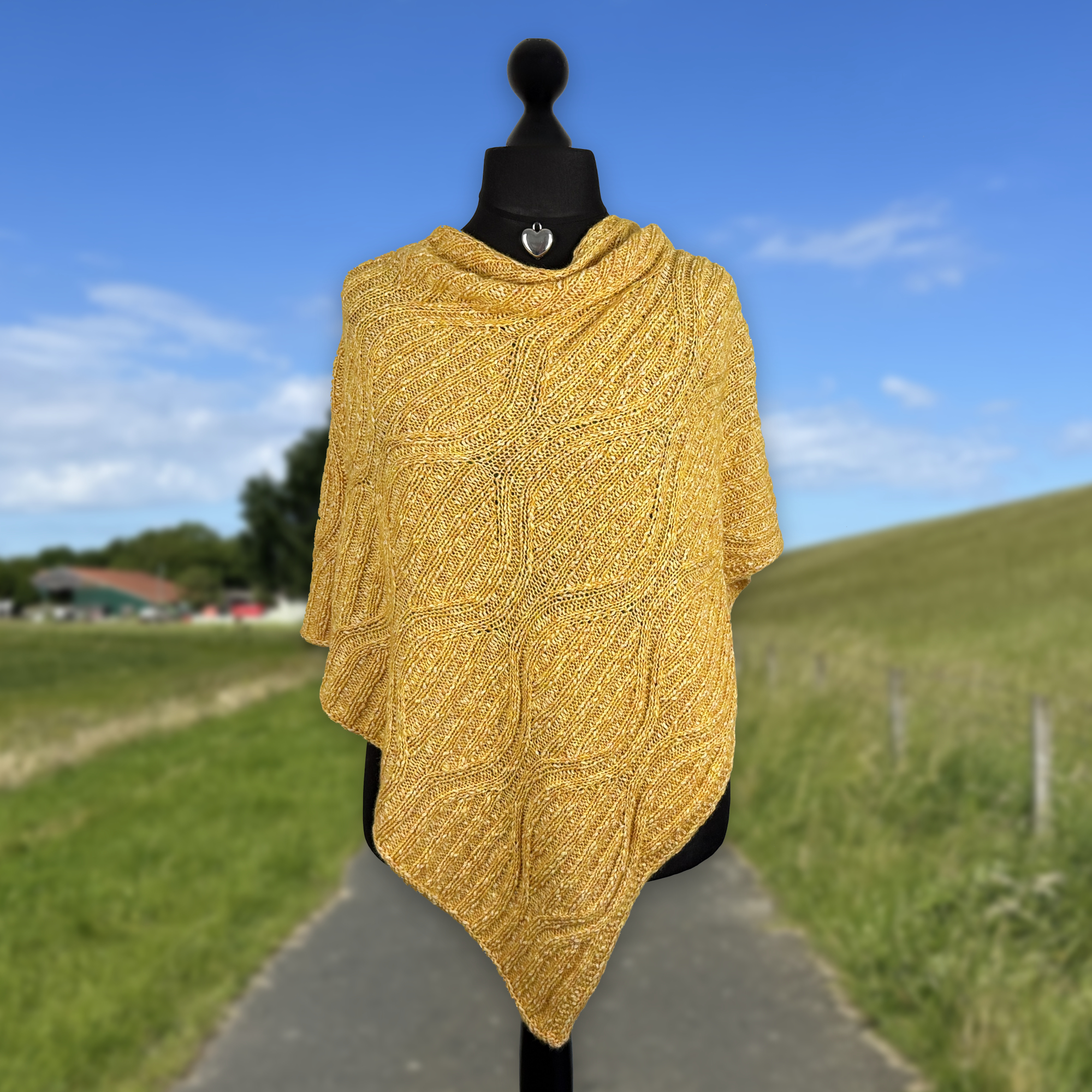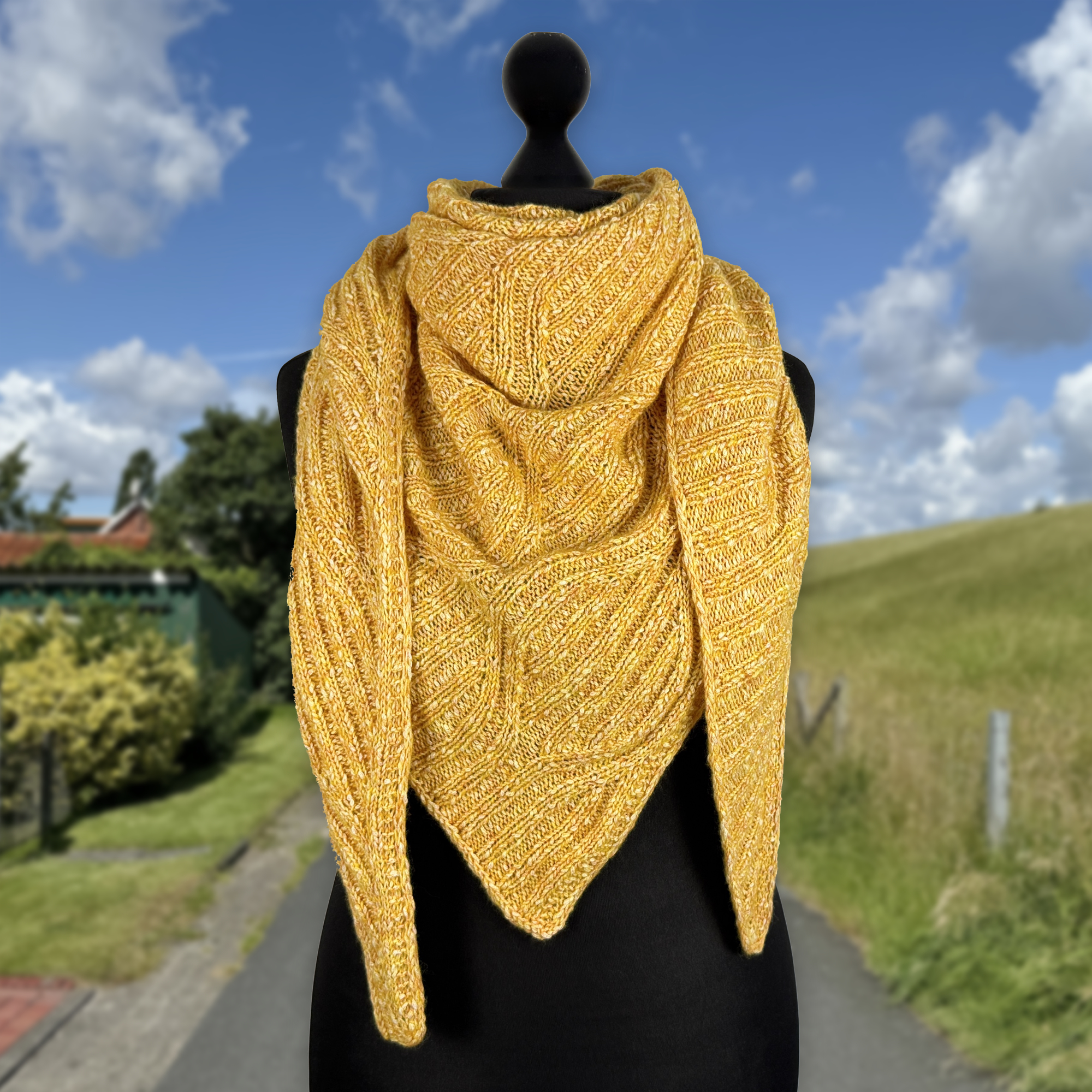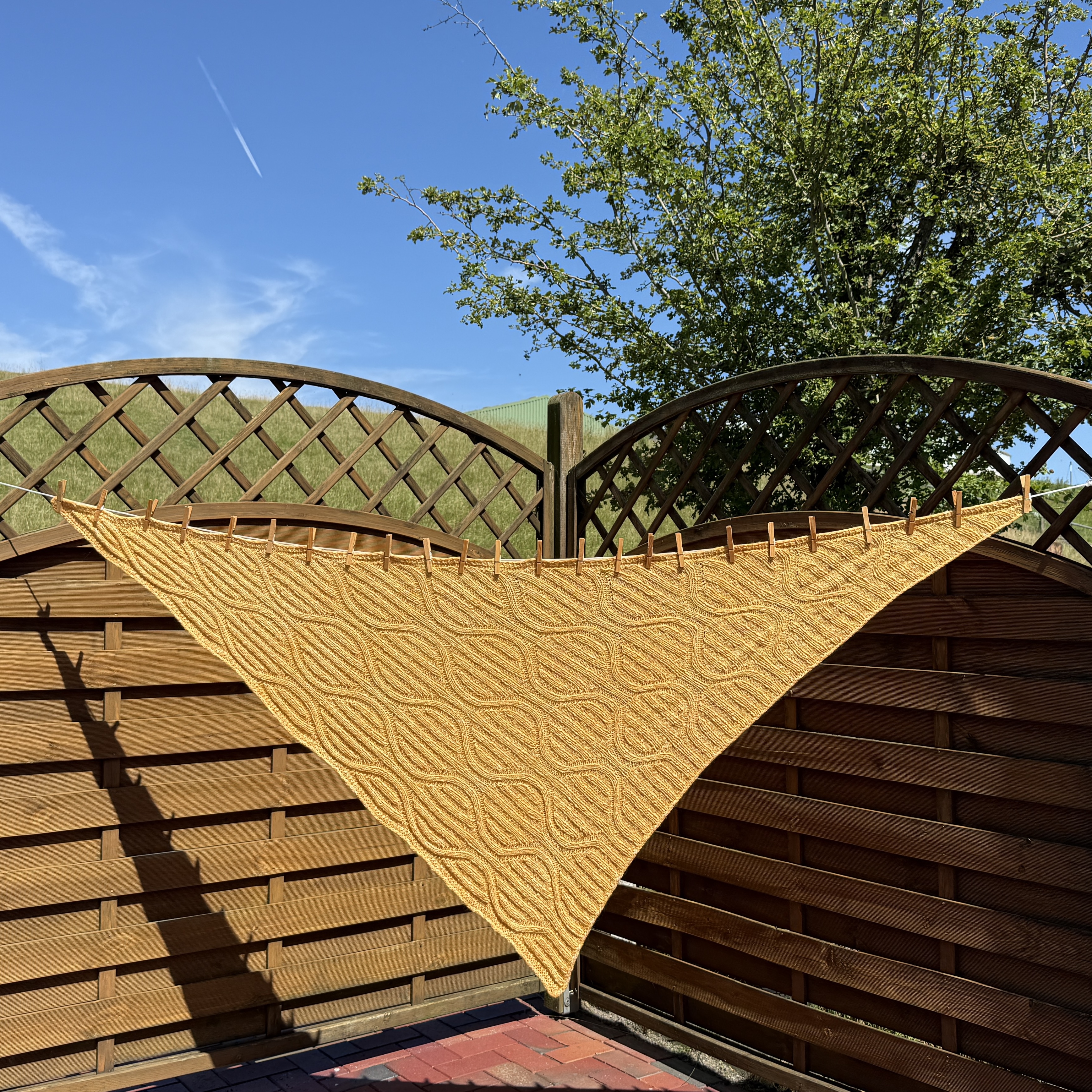 Gestrickt habe ich mit 5er-Nadeln, verbraucht habe ca. 330g/825m. Das fertige Tuch ist ca. 210 x 95cm groß. Die Anleitung für das schöne Tuch findet Ihr hier; es gibt sie auch auf Deutsch.