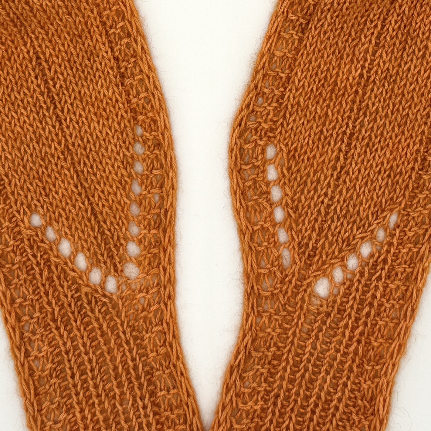 Am rechten Teil die Zunahme mit acht Löchern am Zunahmerand, am linken Teil die Abnahme mit sechs Löchern an beiden Stellen.