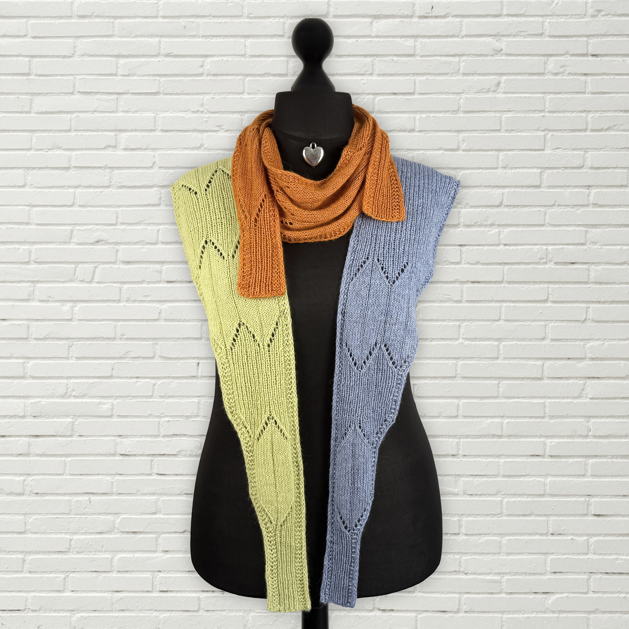 Bei Version 2 habe ich die letzte Verbreiterung weggelassen, um Wolle zu sparen. Um trotzdem genug Länge zu bekommen, habe ich die geraden Teile zwischen den Verbreiterungen um jeweils 8 Reihen verlängert, also anstatt 16 Reihen 24. Am Anfang habe ich statt 32 Reihen 44 gestrickt, am Ende statt 28 Reihen 40. Der Mittelteil ist 20 Reihen lang.
