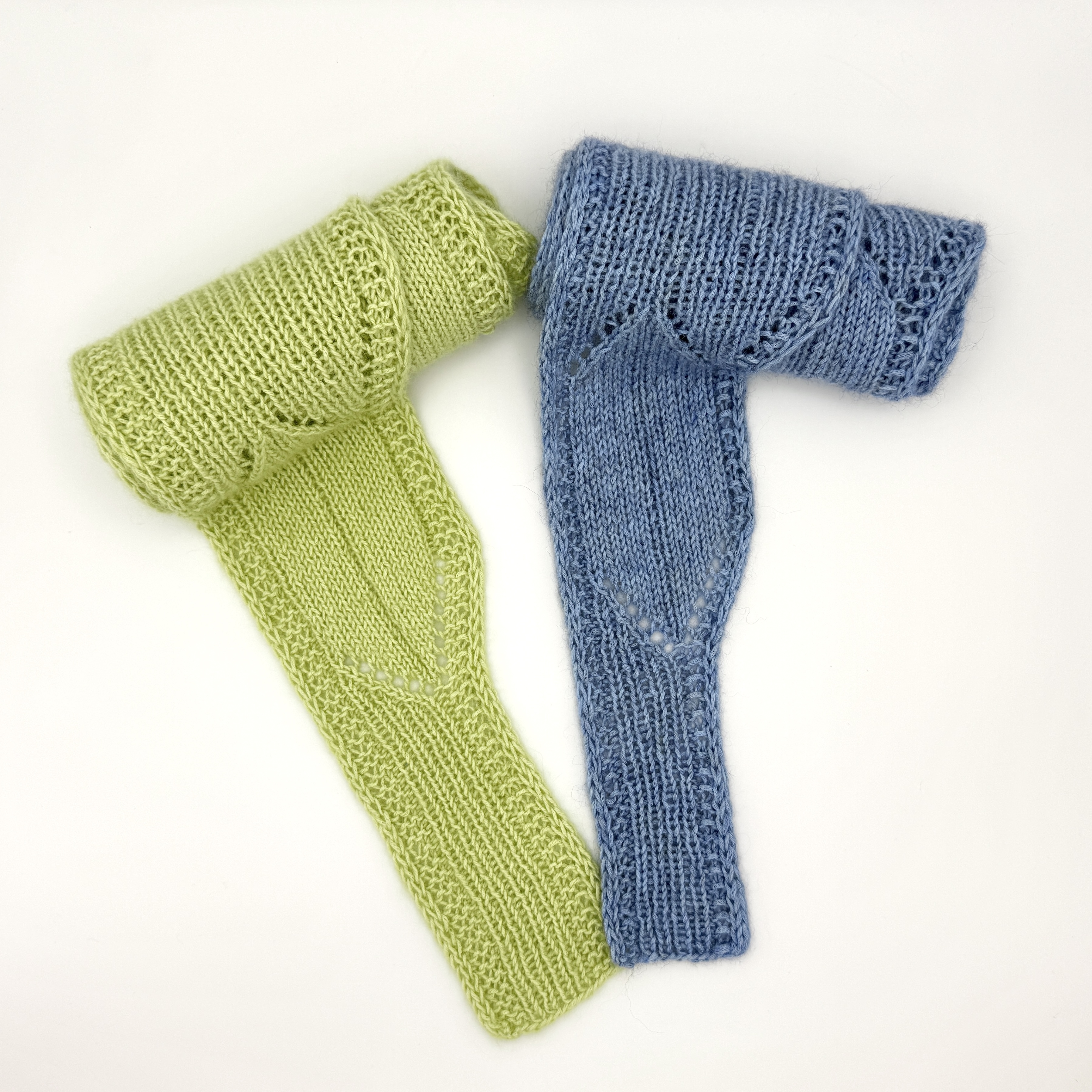 Bei den beiden letzten Zunahmerippen habe ich den Umschlag verschränkt gestrickt, in Reihe 14 links verschränkt und in Reihe 16 rechts verschränkt. Das Ergebnis ist dann symmetrisch zu den Löchern bei der Abnahme: