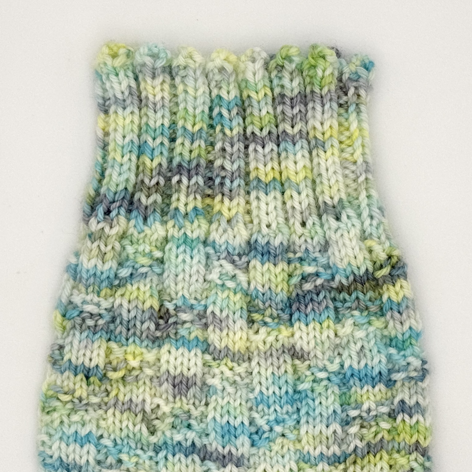Das Muster ist mein Muster ‚Drunter und Drüber‘; ich erkläre es Euch weiter unten. Ich weiß inzwischen, dass es das Muster so oder sehr ähnlich auch von anderen Quellen (natürlich unter anderen Namen) gibt, was aber ja eigentlich auch kein Wunder ist. Wir erfinden ja alle nichts neu, sondern kombinieren nur rechte und linke Maschen.