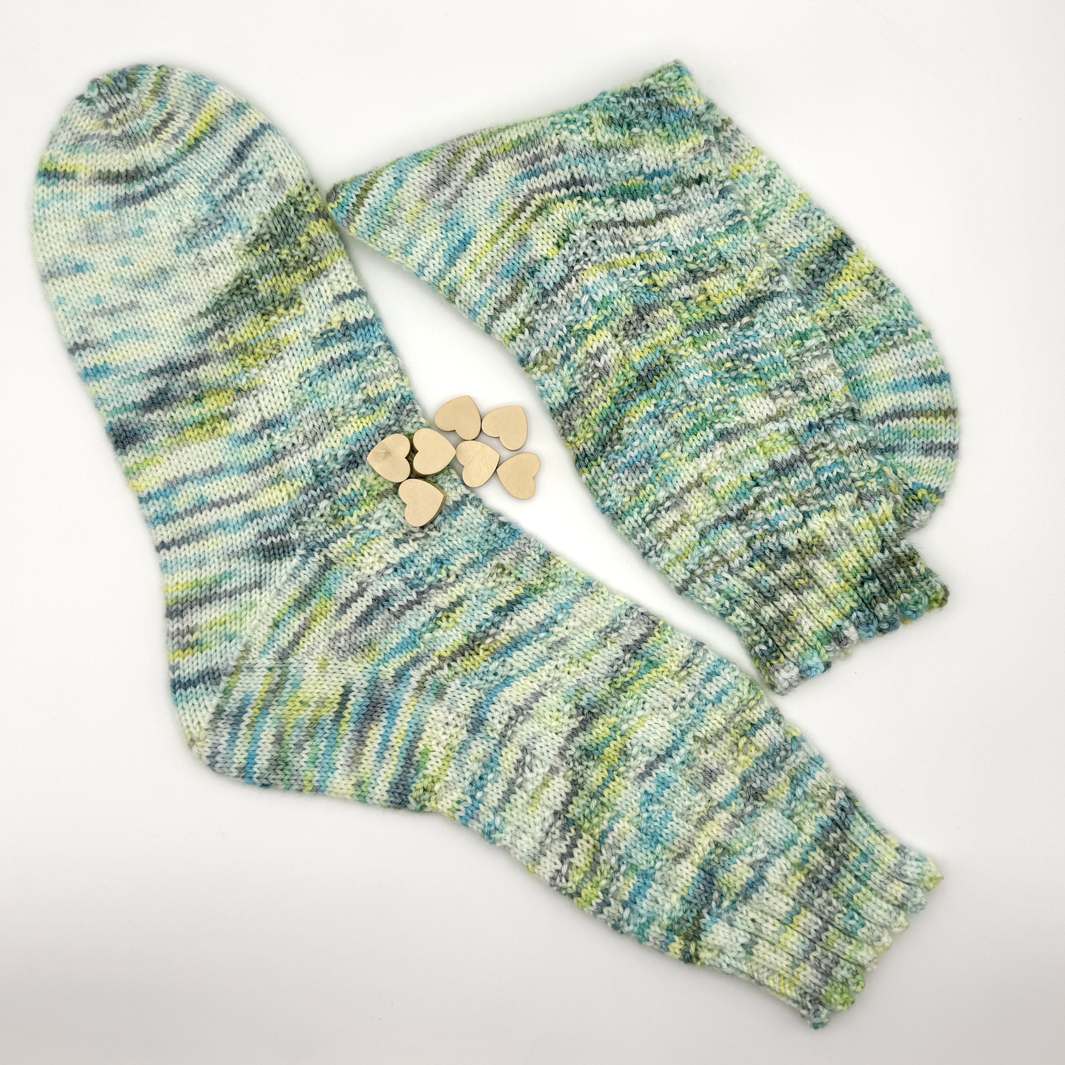 Gestrickt habe ich mit Nadeln in 2,5 und natürlich meiner Lieblingssockenwolle, der von meiner Freundin Nicole in ihrer Klecksküche handgefärbten Merino-Sockenwolle. Verbraucht habe ich knapp 90g.
