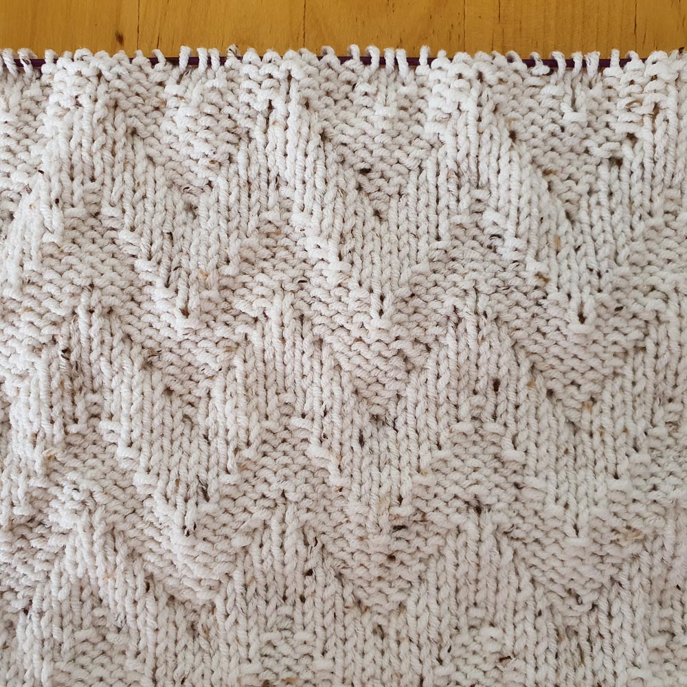 Auch bei einem Seelenwärmer sieht man manchmal die Innenseite, also muss er (für mich) innen genauso aussehen wie außen. Dafür ist ein Muster, das nur aus rechten und linken Maschen besteht, ideal. Ich habe mir deshalb für meinen Seelenwärmer ein einfaches Zackenmuster überlegt.
