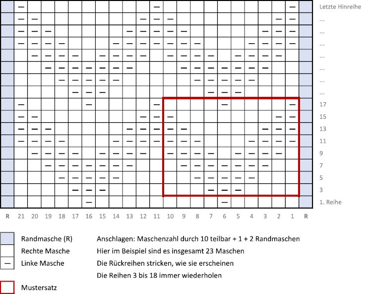 Von dem Muster habe ich mit Excel eine Strickschrift erstellt; es ist meine erste selbst erstellte Strickschrift und ich hoffe, Ihr kommt damit zurecht. Wenn es Verbesserungspotential gibt, schreibt mir das gerne unter diesen Beitrag.