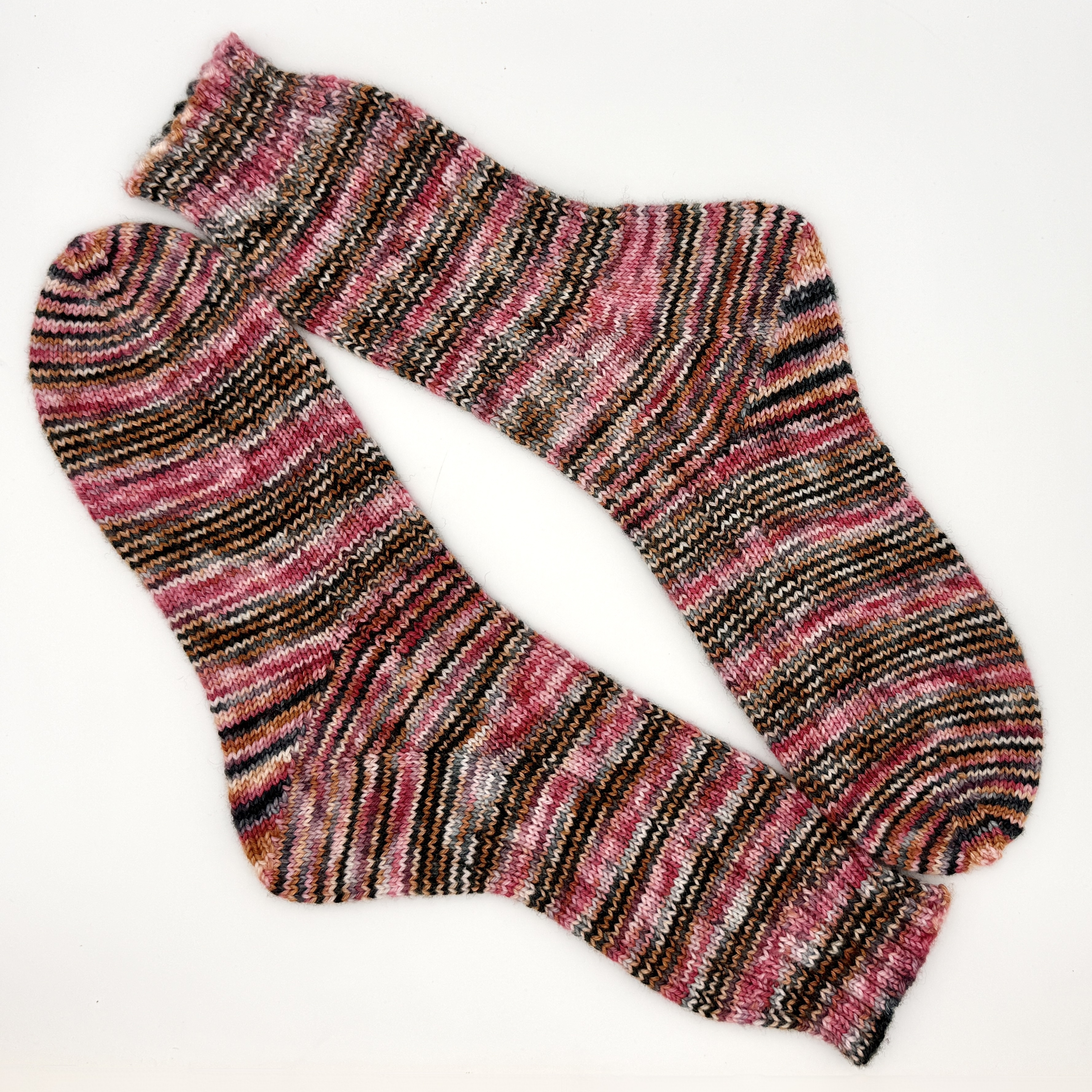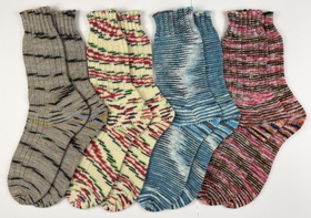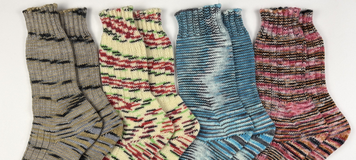 Gestrickt sind alle Paare mit einem 2,5er-Nadelspiel nach meinem vierteiligen Sockentutorial mit ausführlichen Videos, das Ihr hier findet (‚Ursulas Socken-ABSF‘). Verbraucht habe ich für alle vier Paare zwischen 80 und 85g.