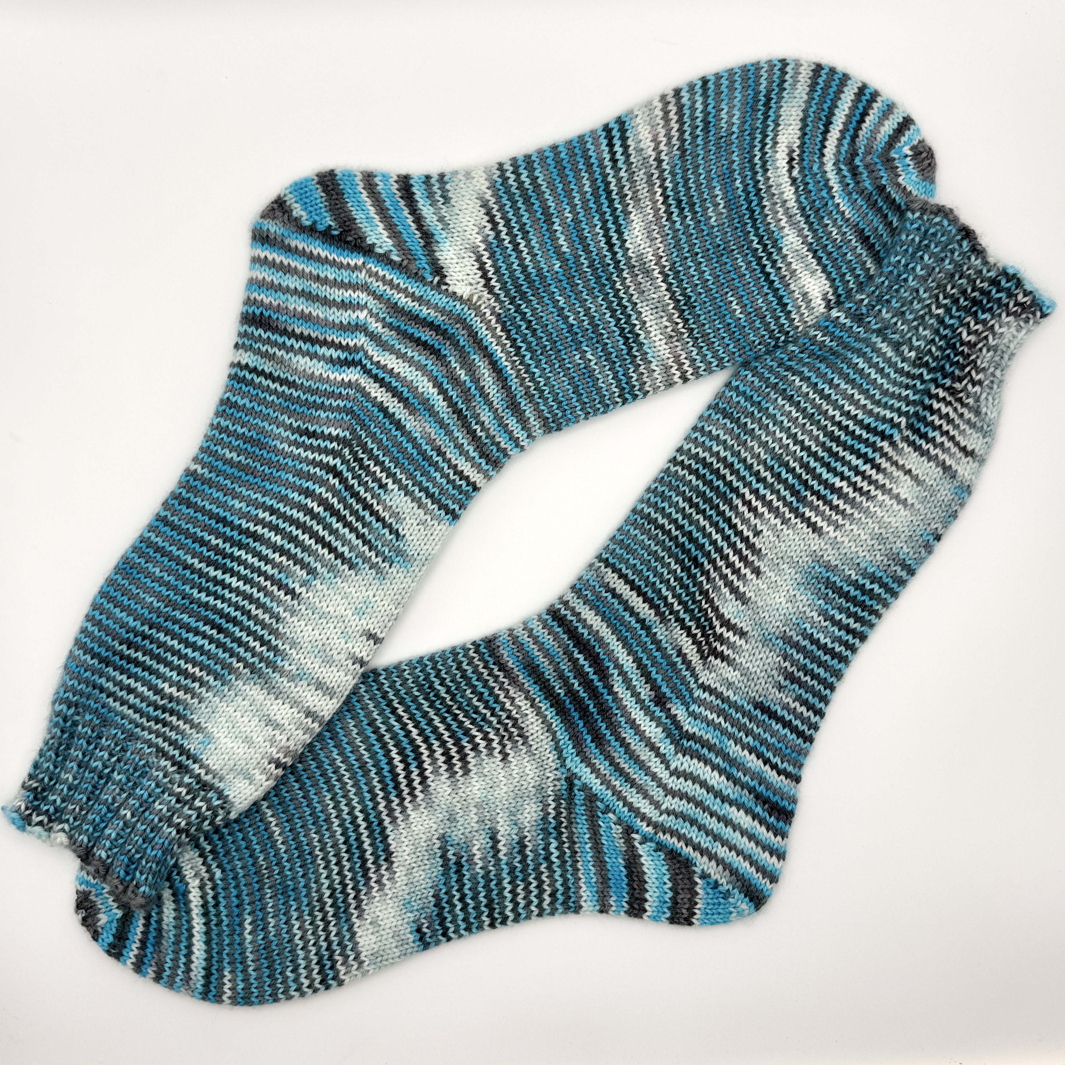 Die blauen Socken sind nach der Anzahl der Runden gleich, aber glatt rechts gestrickt.