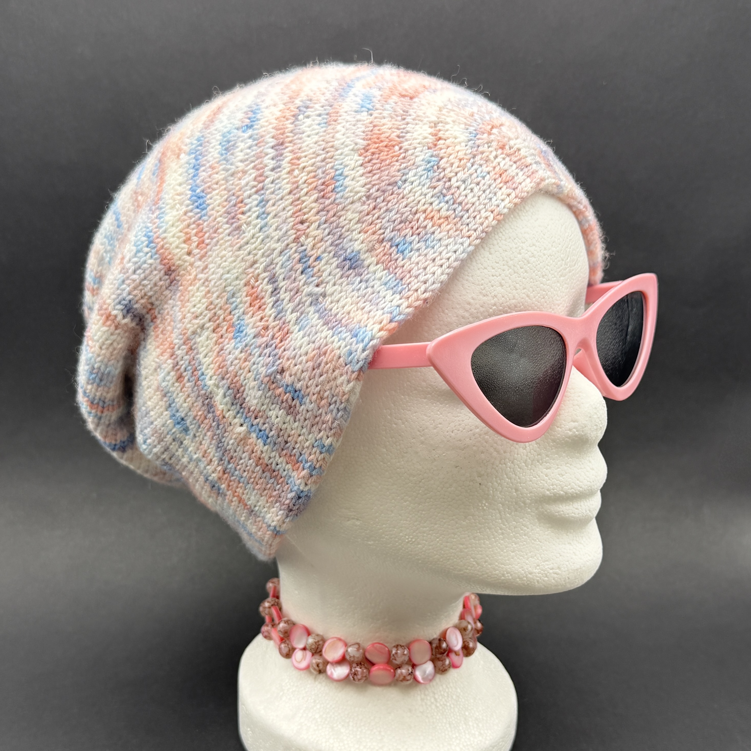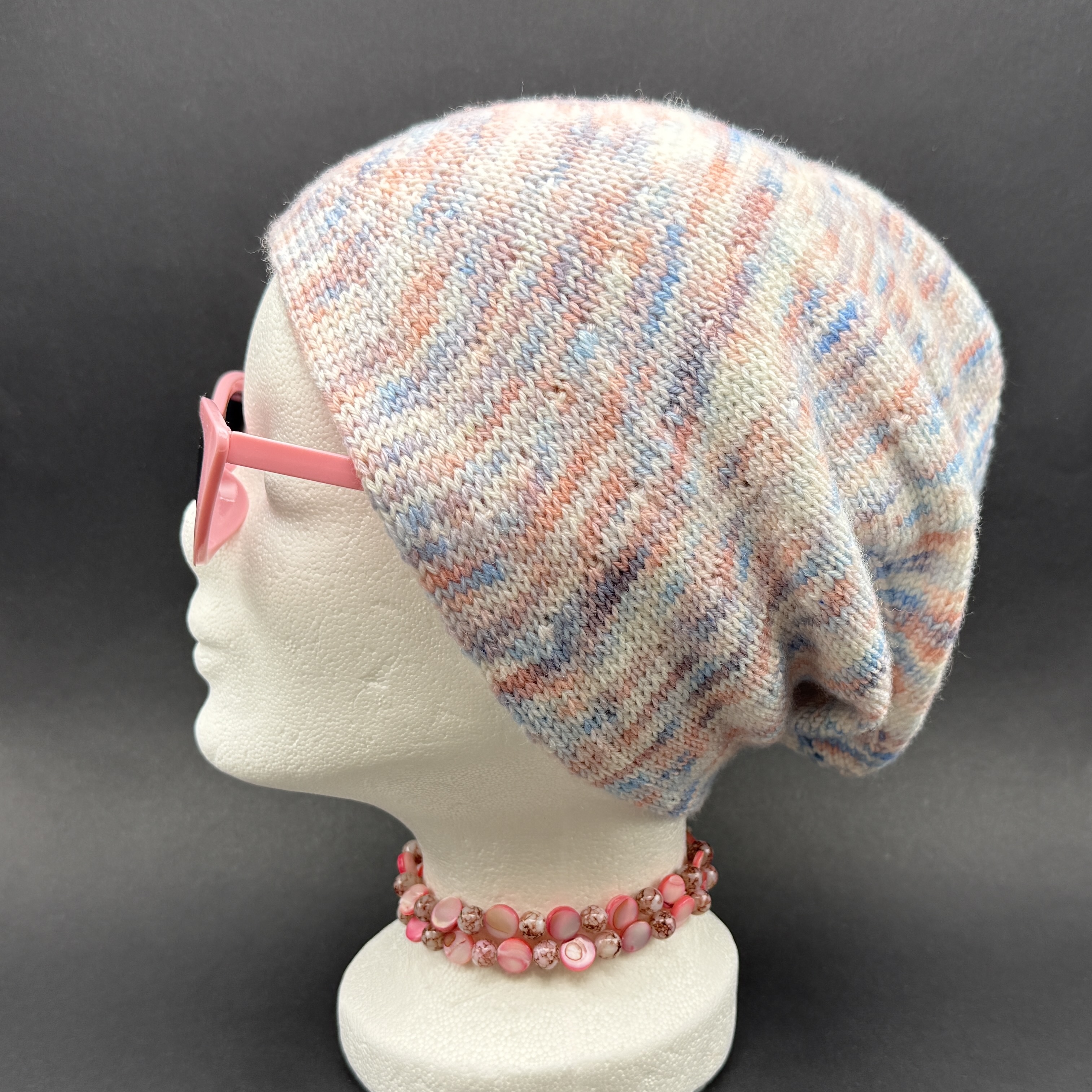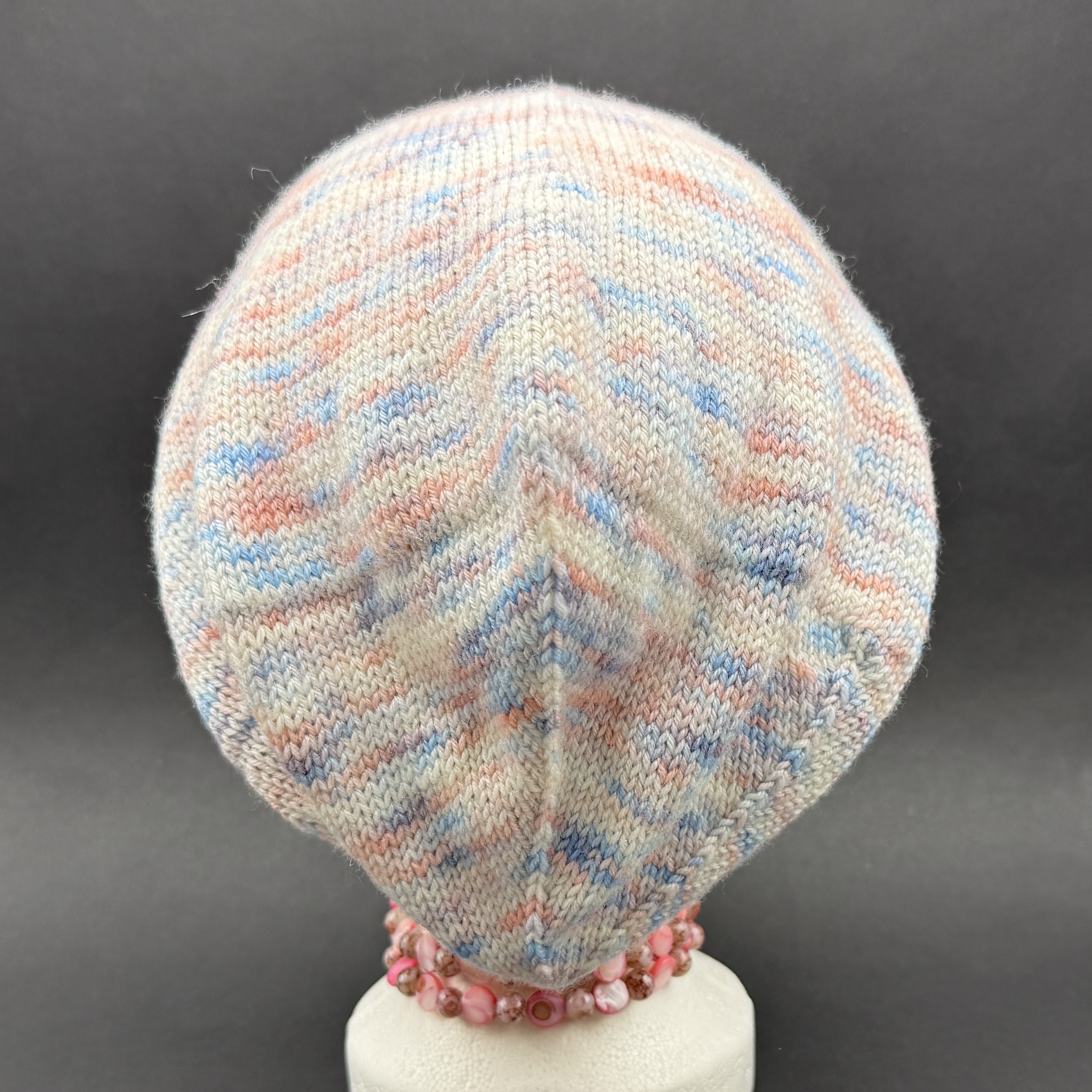 Gestrickt habe ich die Mütze aus Tencel-Sockengarn, das meine Freundin Nicole in ihrer Klecksküche handgefärbt und mir geschenkt hat - tausend lieben Dank dafür. Nicoles Tencel-Sockengarn besteht aus 60% extrafeiner Merinowolle und 40% Tencel; es hat eine Lauflänge von 400m/100g und strickt sich wunderbar. Das Garn (und auch die Mütze) fühlt sich ganz glatt und leicht kühl an, wärmt aber trotzdem ganz wunderbar. Wenn Ihr wissen möchtet, was Tencel (auch bekannt unter Lyocell) eigentlich ist: Schaut mal hier bei Wikipedia.