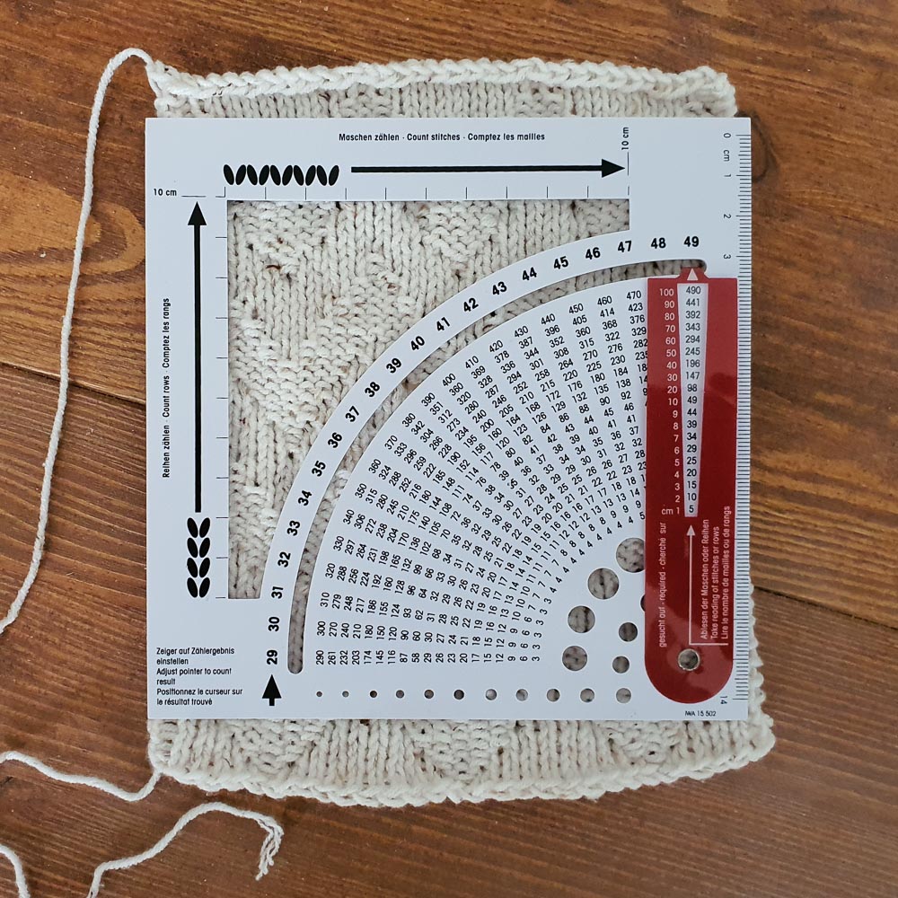 Danach lässt man die Maschenprobe trocknen und dann beginnt das Auszählen (wie Ihr Maschen zählt, ist hier erklärt); ich mache das mit einem Zählrahmen von Prym, der ausgesprochen praktisch ist. Mit einem Maßband tue ich mich da immer sehr schwer.