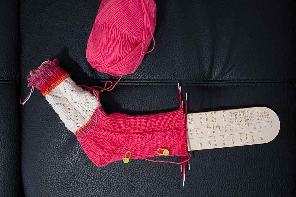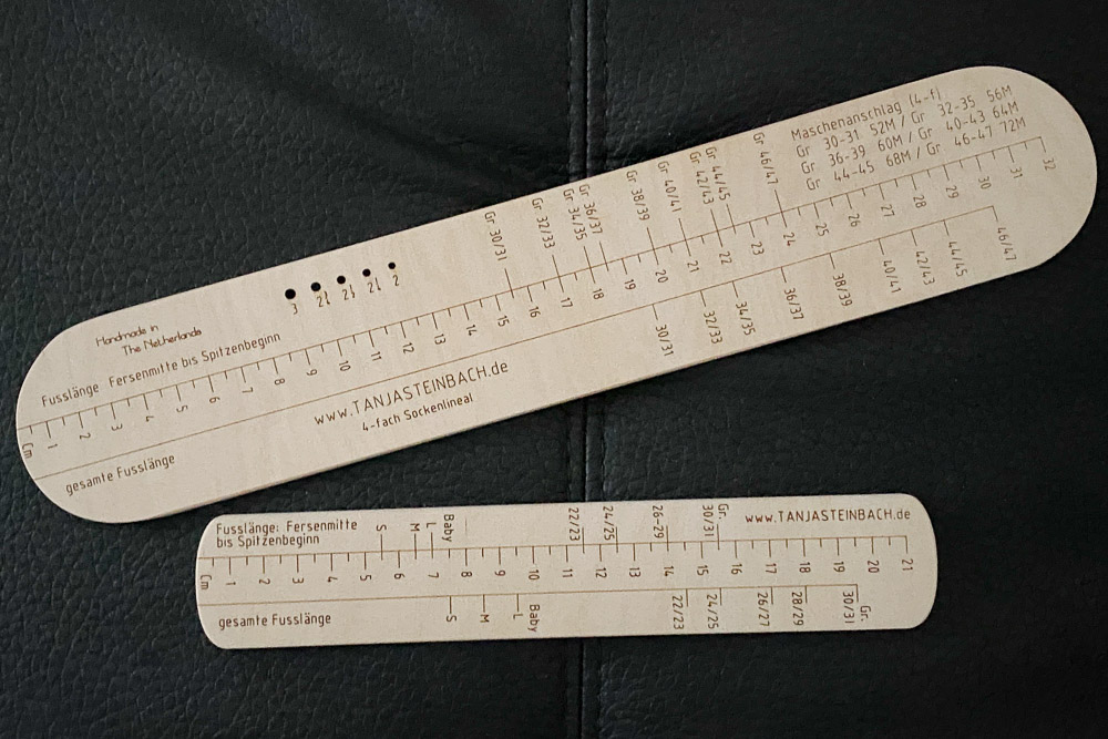 Ich finde es furchtbar schwierig, aus der Ferne passende Socken zu stricken, also wenn man die Socken nicht anprobieren kann. Inzwischen bin ich stolze Besitzerin eines Sockenlineals und das ist wirklich eine tolle Sache. Ich habe zwei Größen: Eins für Babys/Kinder und eins für Erwachsene, so bin ich für alle Eventualitäten bis Größe 47 gerüstet: