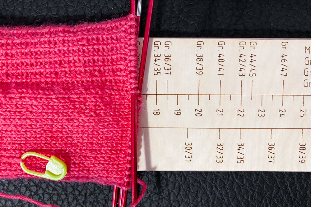 Man steckt das Lineal in die Socke und liest vorne ab, wie weit man ist. Aufgedruckt sind nicht nur Zentimeter-Angaben sondern auch Größenangaben, das ist ausgesprochen hilfreich. Ausgelegt sind die Angaben auf dem Lineal, wann man mit der Spitze beginnen muss, für Socken mit den normalen Bandspitzen nach den gängigen Tabellen (zum Beispiel von Regia); da ich diese Spitzen immer stricke, passt das perfekt. Lediglich die Löcher zum Feststellen der Nadelgröße sind verkehrt; bei mir stimmt kein einziges.