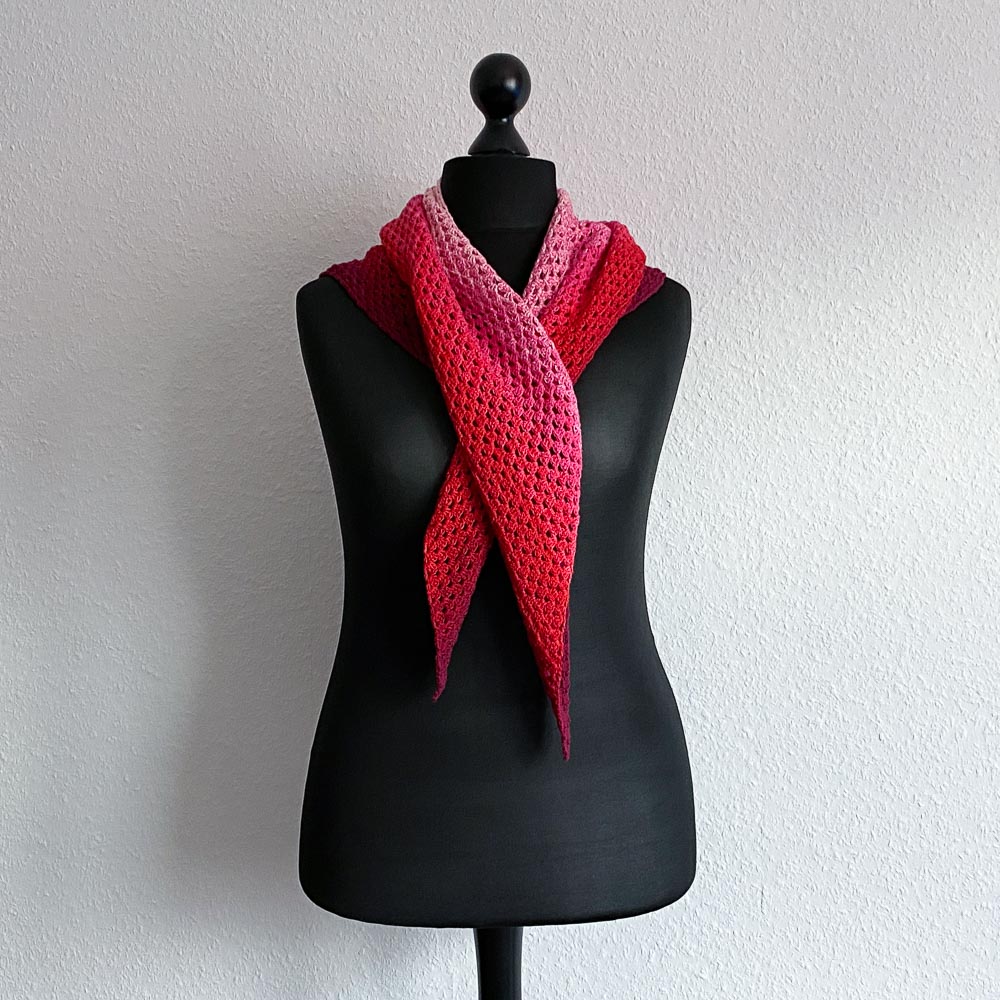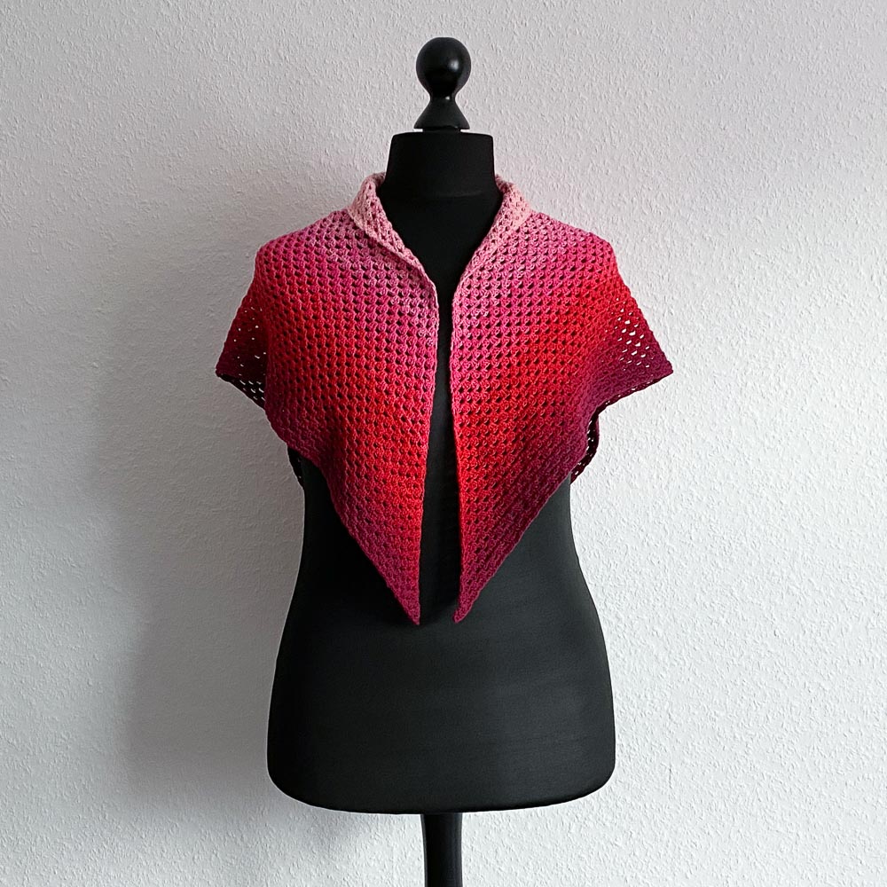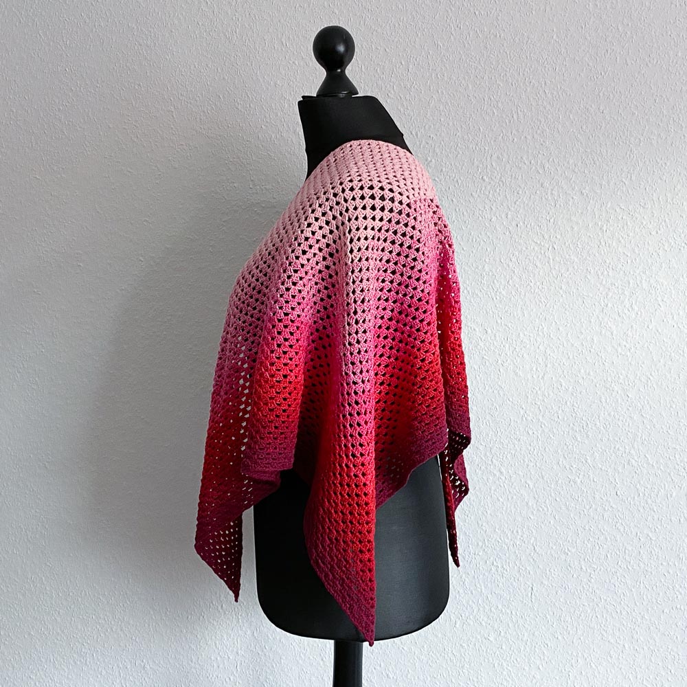 Verhäkelt habe ich einen Bobbel, den ich letztes Jahr im Black Friday-Sale bei Hobbii gekauft habe; er war aus reiner Baumwolle, 200 Gramm schwer und mit einer Lauflänge von 800 Metern. Das Tuch hat damit eine Spannweite von ca. 146 cm und eine Höhe von der Halskante zur Spitze von ca. 73 cm bekommen.
