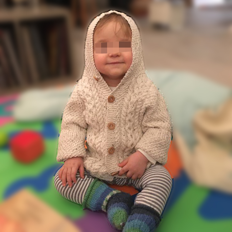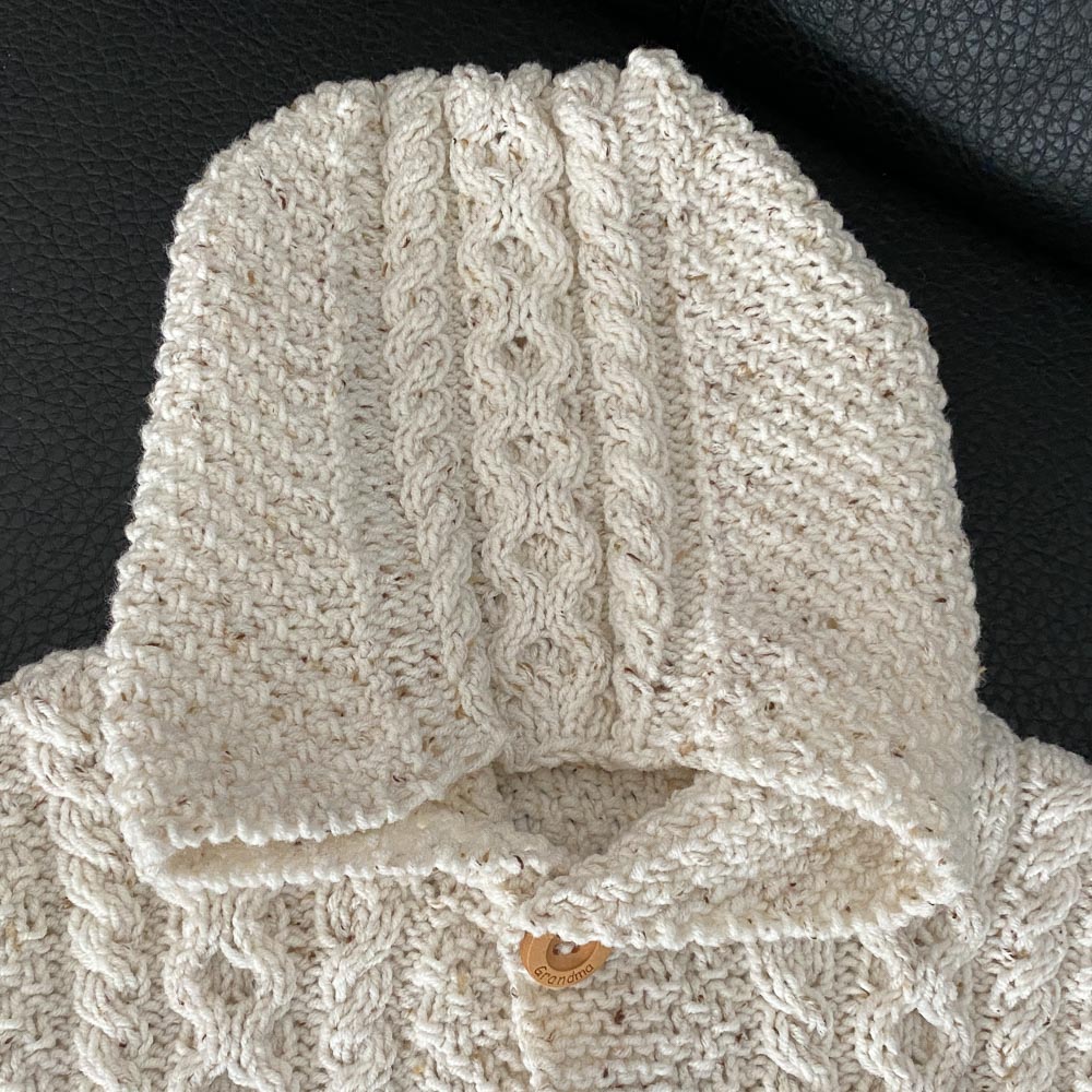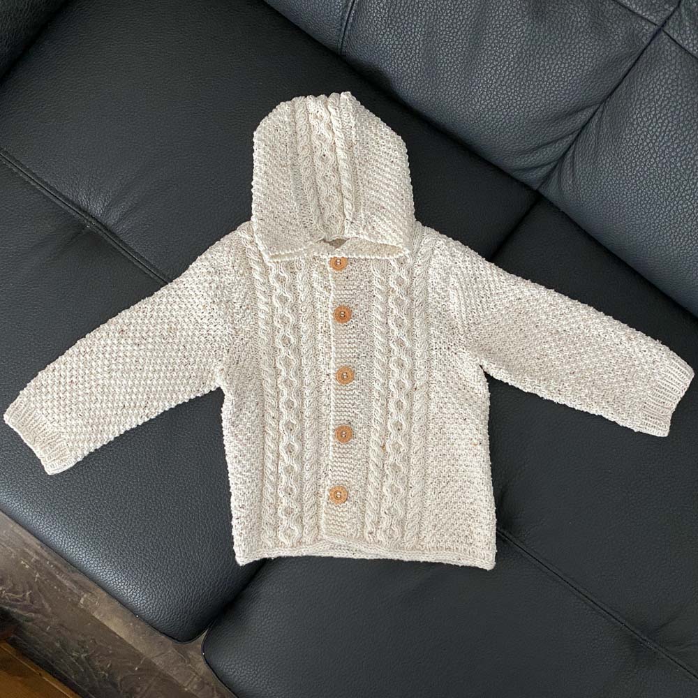 Gestrickt habe ich die Jacke Anfang Oktober 2020; angeblich habe ich sie in der Größe für neun bis zwölf Monate gestrickt, aber Theorie und Praxis sind ja bekanntlich zwei unterschiedliche Dinge. Gestern habe ich ein Foto von unserem Enkel (der in ein paar Tagen elf Monate alt wird) in der Jacke bekommen; die Kapuze passt, die Jacke so einigermaßen und die Ärmel sind viel zu lang. Aber laut unserer Schwiegertochter fühlt er sich in der Jacke sehr wohl.