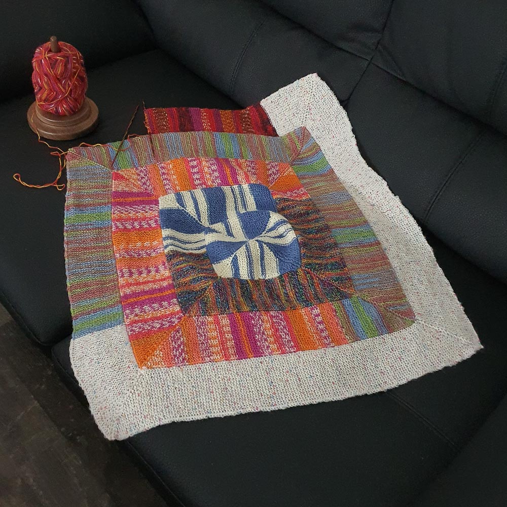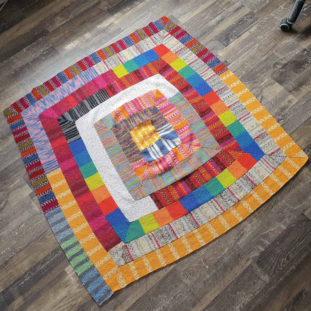 Per Zufall bin ich auf eine bestimmte Art und Weise gestoßen, wie man eine Decke stricken kann; die Bezeichnung dafür ist 10-Stitch-Blanket, zu Deutsch 10-Maschen-Decke. Man fängt mit einem kleinen Quadrat oder Rechteck an und strickt dann immer zehn Maschen breit rundrum, wobei die Runden wie eine (in diesem Fall eckige) Spirale immer größer werden.