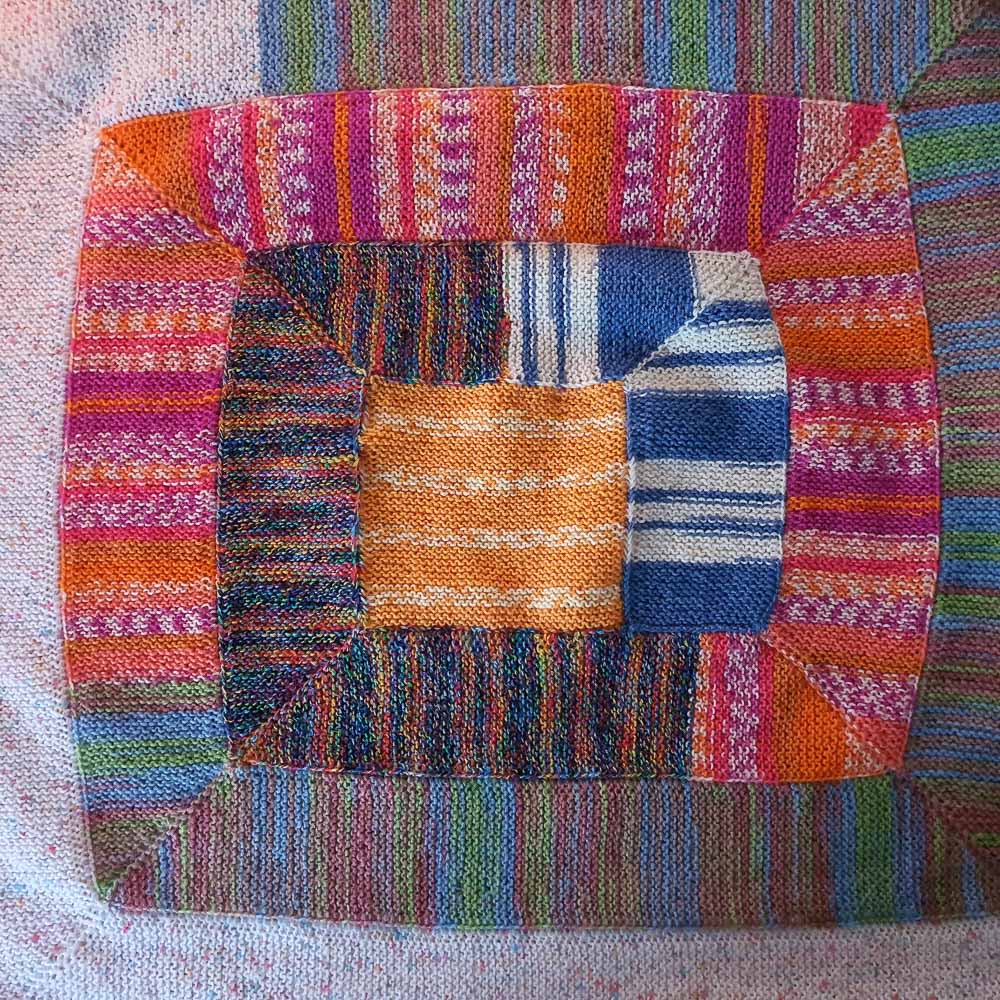 Inzwischen ist die Decke fertig; sie ist ca. 1,30 x 1,30 groß geworden und genauso bunt und fröhlich geworden, wir ich mir das vorgestellt hatte. Ich bin sicher, dass das nicht die letzte Decke dieser Art war, die ich gestrickt habe.