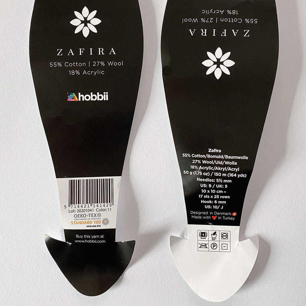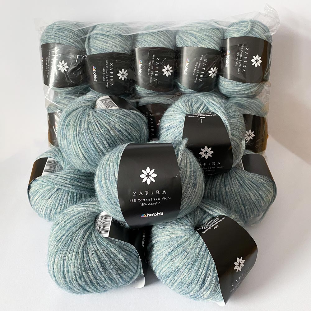 Heute ist mein Wollpaket angekommen und es gefällt mir sehr gut. Die Wolle ist Zafira von Hobbii; sie besteht zu 55 % aus Baumwolle, 27 % aus Schurwolle und 18 % aus Acryl und fühlt sich sehr leicht und weich an. Im Paket waren 18 Knäuel davon in Farbe 11 (Vintage Denim), die hatte ich mir ausgesucht. Dazu noch ein Tütchen Maschenmarkierer und ein Hobbii-Anstecker, der jetzt nicht wirklich hätte sein müssen.