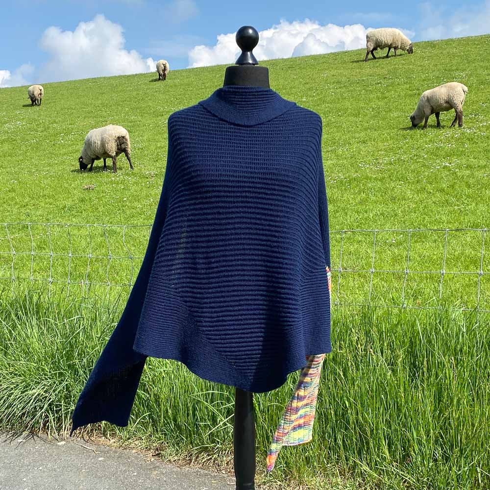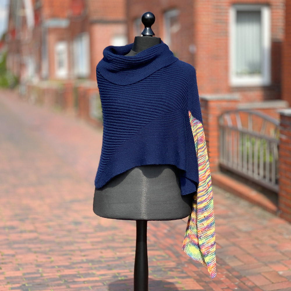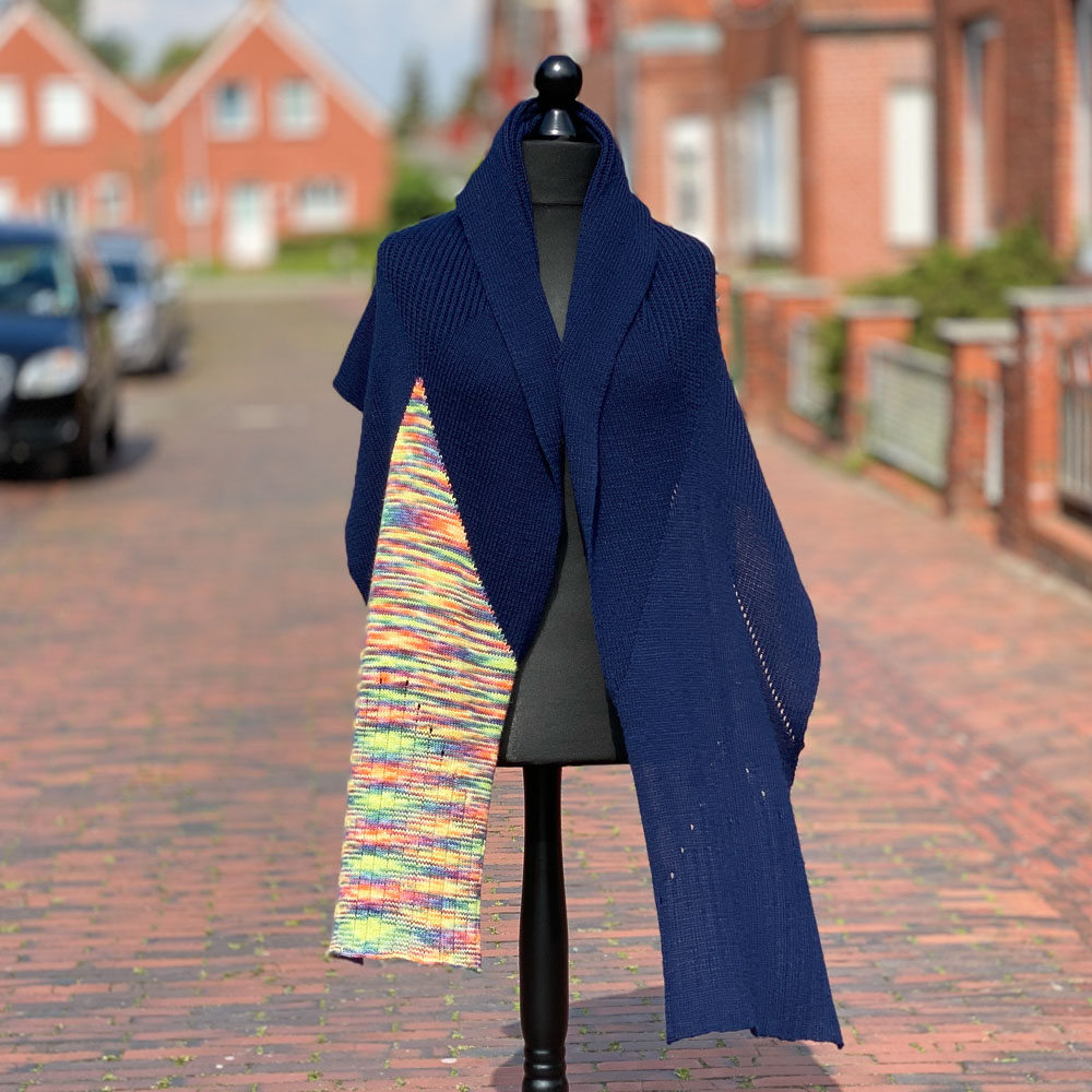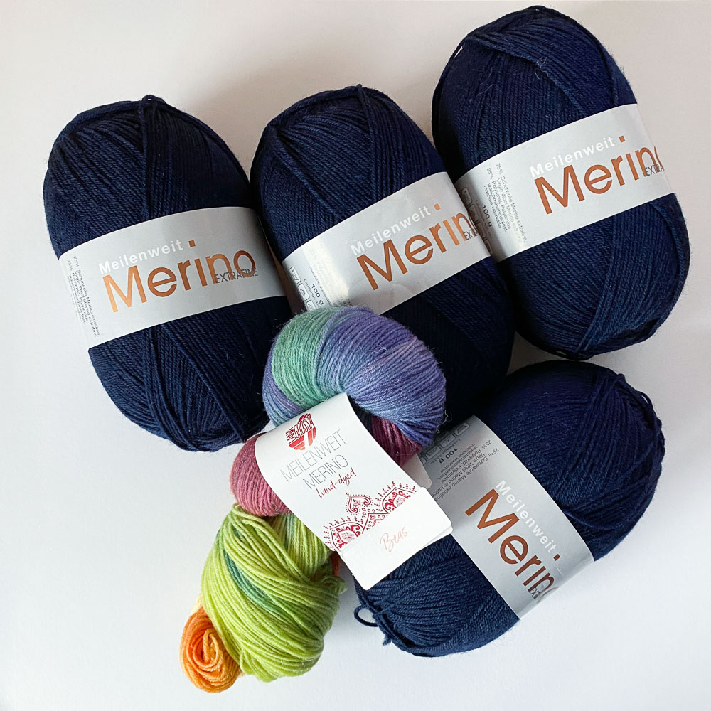 Die Wolle war schnell gefunden; ich hatte im Fundus noch vier Knäule dunkelblaue Merino-Sockenwolle von Lana Grossa, aus der ich ursprünglich mal eine große Decke für den Enkel stricken wollte. Als Kontrast wollte ich kein Ton-in-Ton haben, sondern etwas ganz anderes, weshalb ich mir einen Strang handgefärbte Merino-Sockenwolle, auch von Lana Grossa, gekauft habe. Ich hatte also 400 Gramm bzw. 1.680 Meter dunkelblaue und 100 Gramm bzw. 420 Meter bunte Wolle.