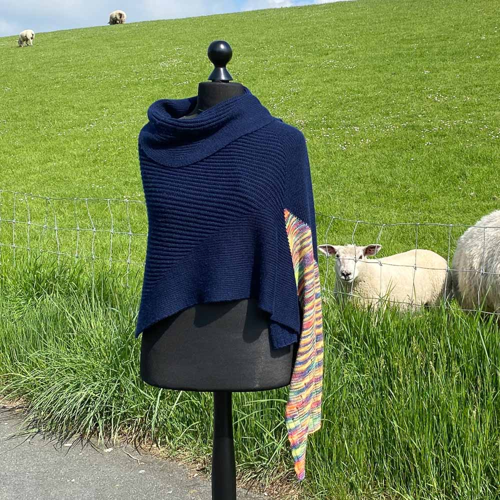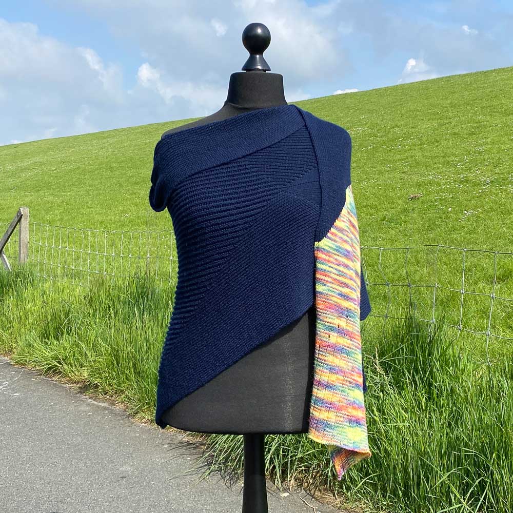 Das Tuch ist gewaschen und gespannt 2,35 m lang und zwischen 42 und 112 cm breit. Verbraucht habe ich knappe 380 Gramm dunkelblaue und 63 Gramm bunte Wolle.