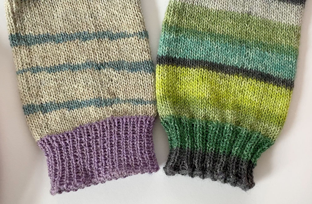 Mein Anschlag funktioniert nicht nur für Zwei-rechts-zwei-links-, sondern auch für Eins-rechts-eins-links-Bündchen. Ich persönlich mag Zwei-rechts-zwei-links-Bündchen am liebsten und stricke geschätzte 90 Prozent meiner Socken damit; sie haben sich für mich einfach am besten bewährt.