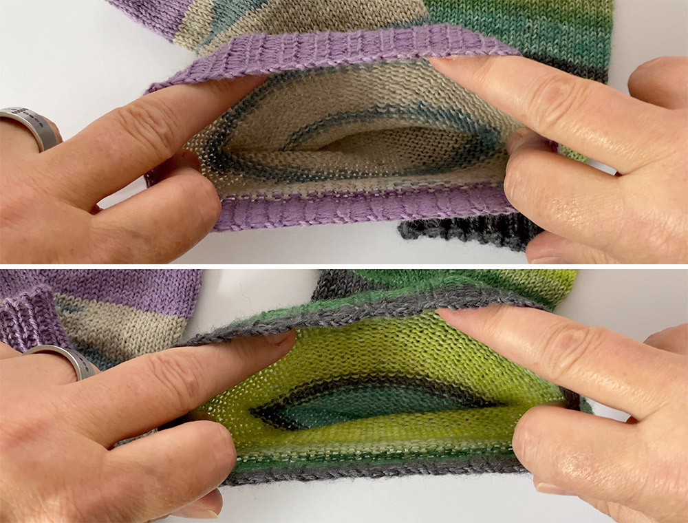 Bei Bündchen, bei denen die Anzahl von rechten und linken Maschen nicht gleich ist, funktioniert der Anschlag nicht.