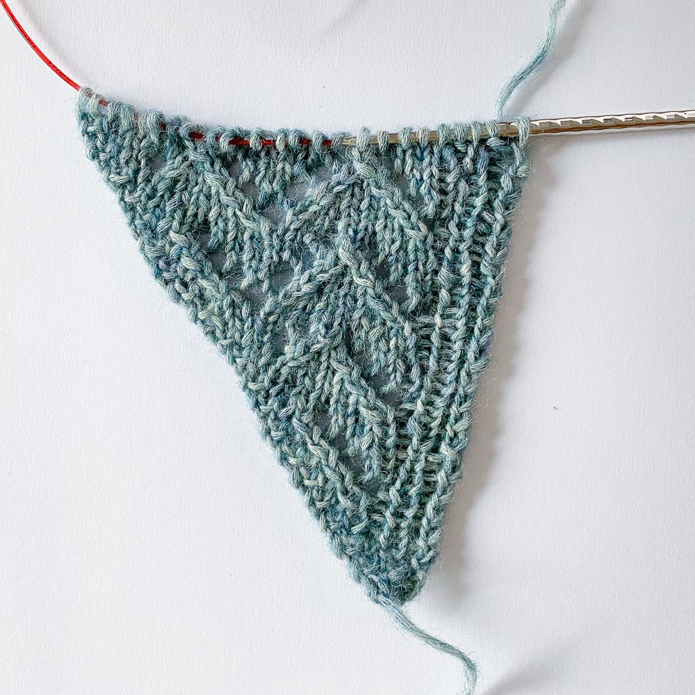 Ich habe mich also entschieden, den KAL nicht mitzumachen und aus dem Garn ein schönes Tuch zu stricken, das Kyler-Tuch von Isabell Kraemer. Ihre Anleitungen sind glasklar, man kann sie wunderbar nachstricken und das Muster ist so berechnet, dass es perfekt zur Maschenzahl passt, und zwar in jeder Reihe. Das Tuch stricke ich übrigens mit 5er-Nadeln.