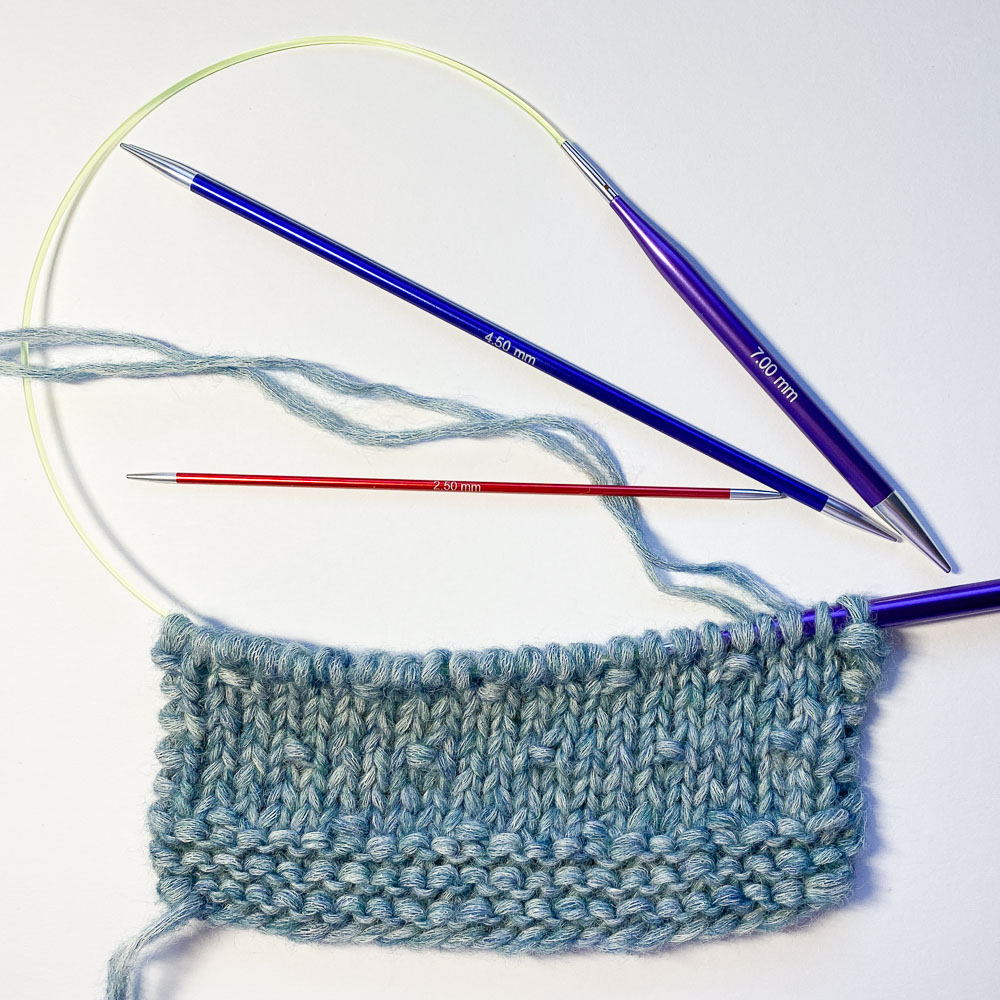 Ich habe mal ein schmales Stückchen nach der Anleitung gestrickt und auf dem Bild als Vergleich zu den 7er-Nadeln eine 2,5er- und eine 4,5er-Nadel gelegt. Ich glaube, man sieht sowohl die Dichte des Gestricks (was für eine Sommerdecke ist eigentlich so dick und dicht?) und auch den Umfang der benötigten Nadeln. Bitte entschuldigt die Farbqualität des Bildes; ich habe das Foto bei künstlichem Licht gemacht, weil es schon dunkel war.