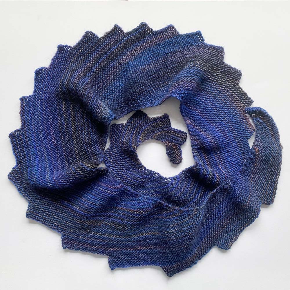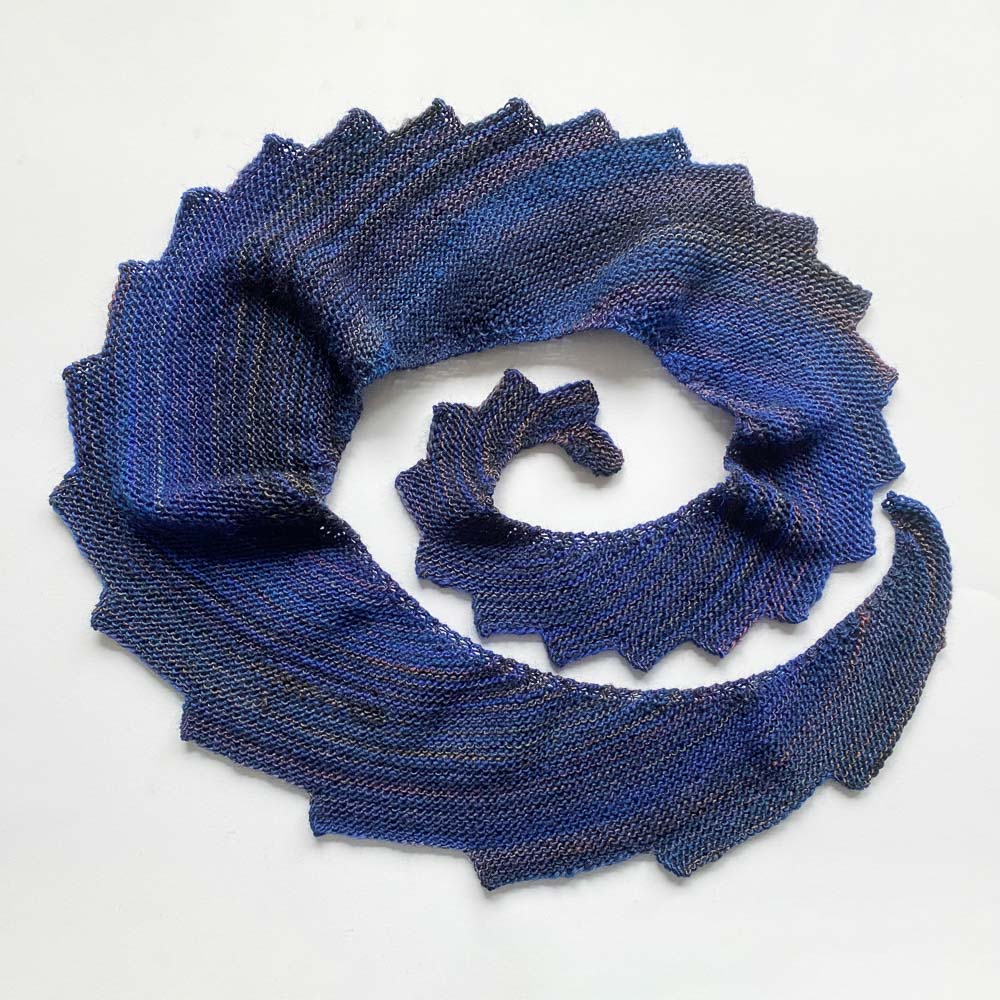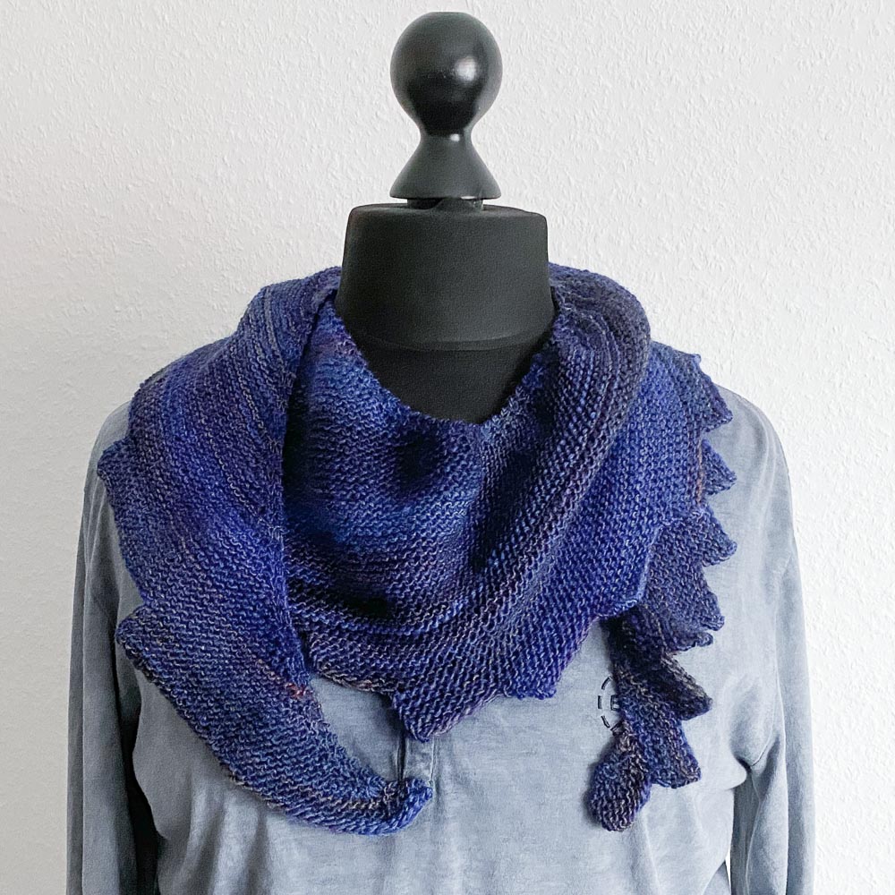 Ich hatte noch einen Rest Winter Glow von Hobbii in der Farbe Electric Blue/Purple/Dark Navy (08); daraus habe ich mit 4er-Nadeln einen ca. 165cm langen Drachenschwanz gestrickt. Er ist herrlich weich und federleicht (ich habe 80 Gramm Wolle verbraucht) und hat das Zeug zum Lieblingsschal. Ich glaube, das war nicht mein letzter Drachenschwanz.