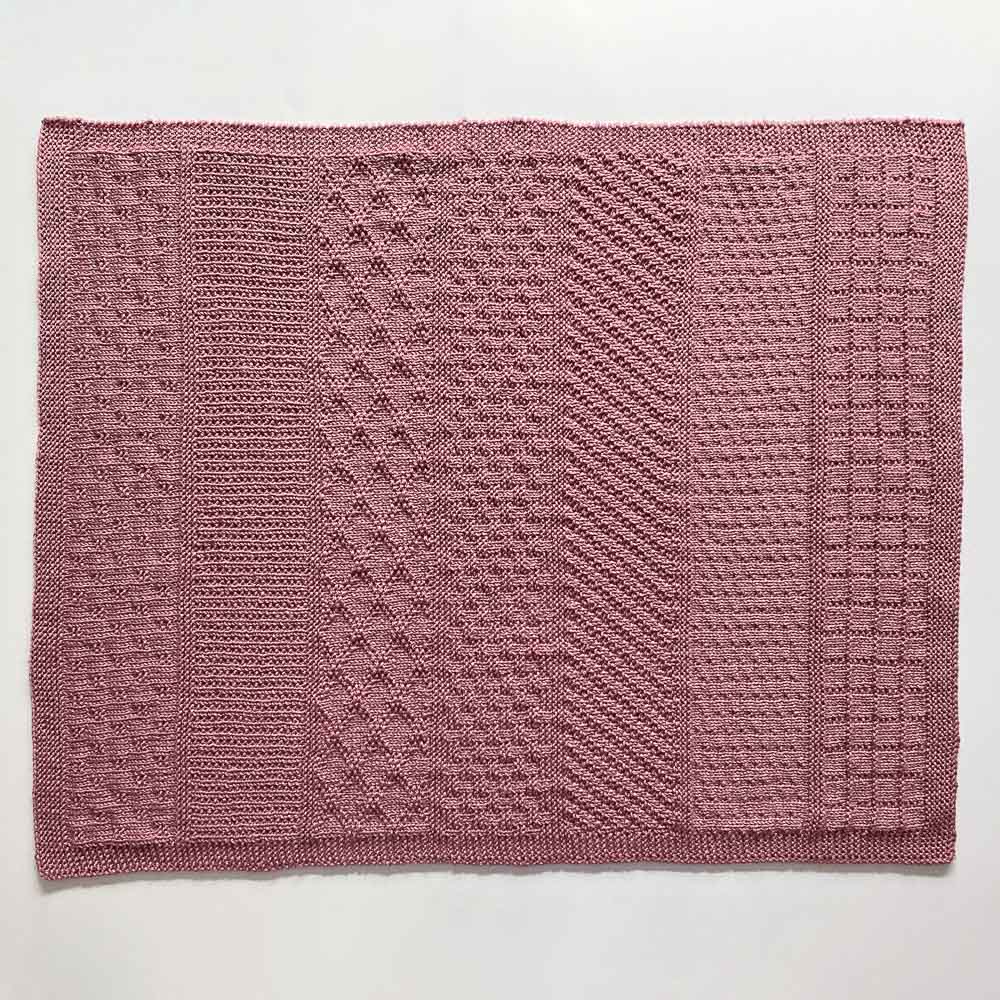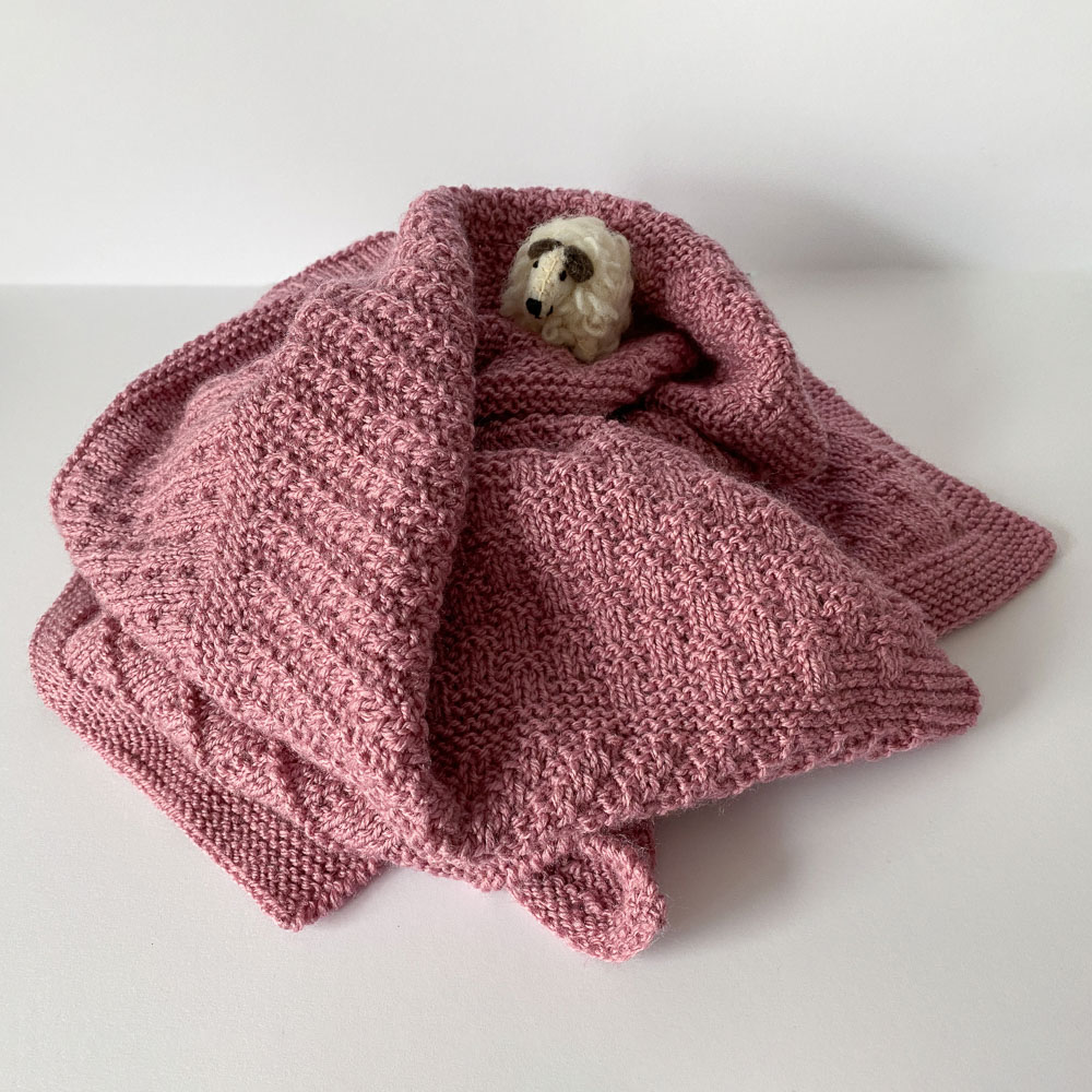 - Die Decke wird laut Anleitung durchgängig mit 4er-Nadeln gestrickt, auch die Kraus-Rippen. Davon rate ich dringend ab, denn Krausrippen sind immer leicht breiter als Mustergestricktes und werfen deshalb Wellen. Klar kriegt man die weg, wenn man die Decke spannt, aber wer möchte schon eine Babydecke nach jeder Wäsche spannen? Deshalb habe ich alle Krausrippen, sowohl an Anfang und Ende als auch zwischen den Mustern mit 3,5er-Nadeln gestrickt, also eine halbe Nummer kleiner. So passt alles zusammen und gespannt werden muss auch nichts.