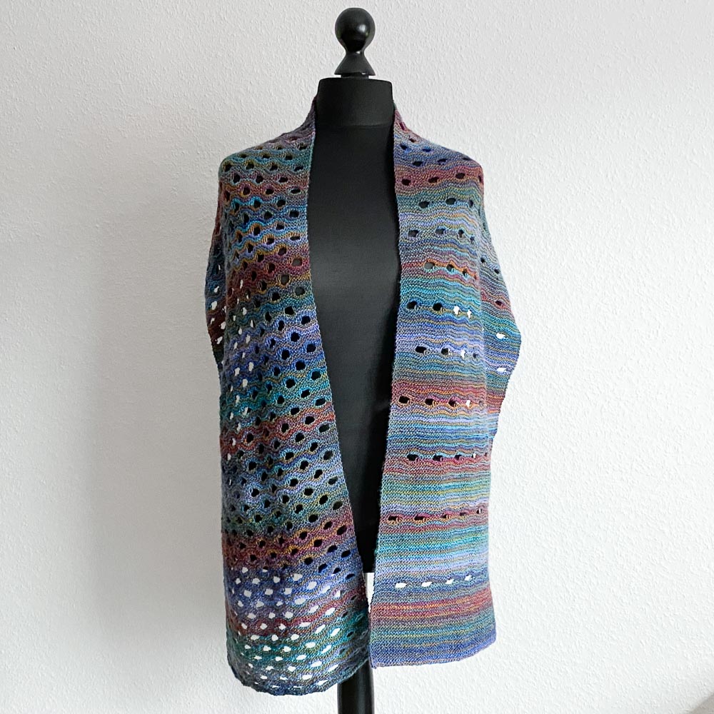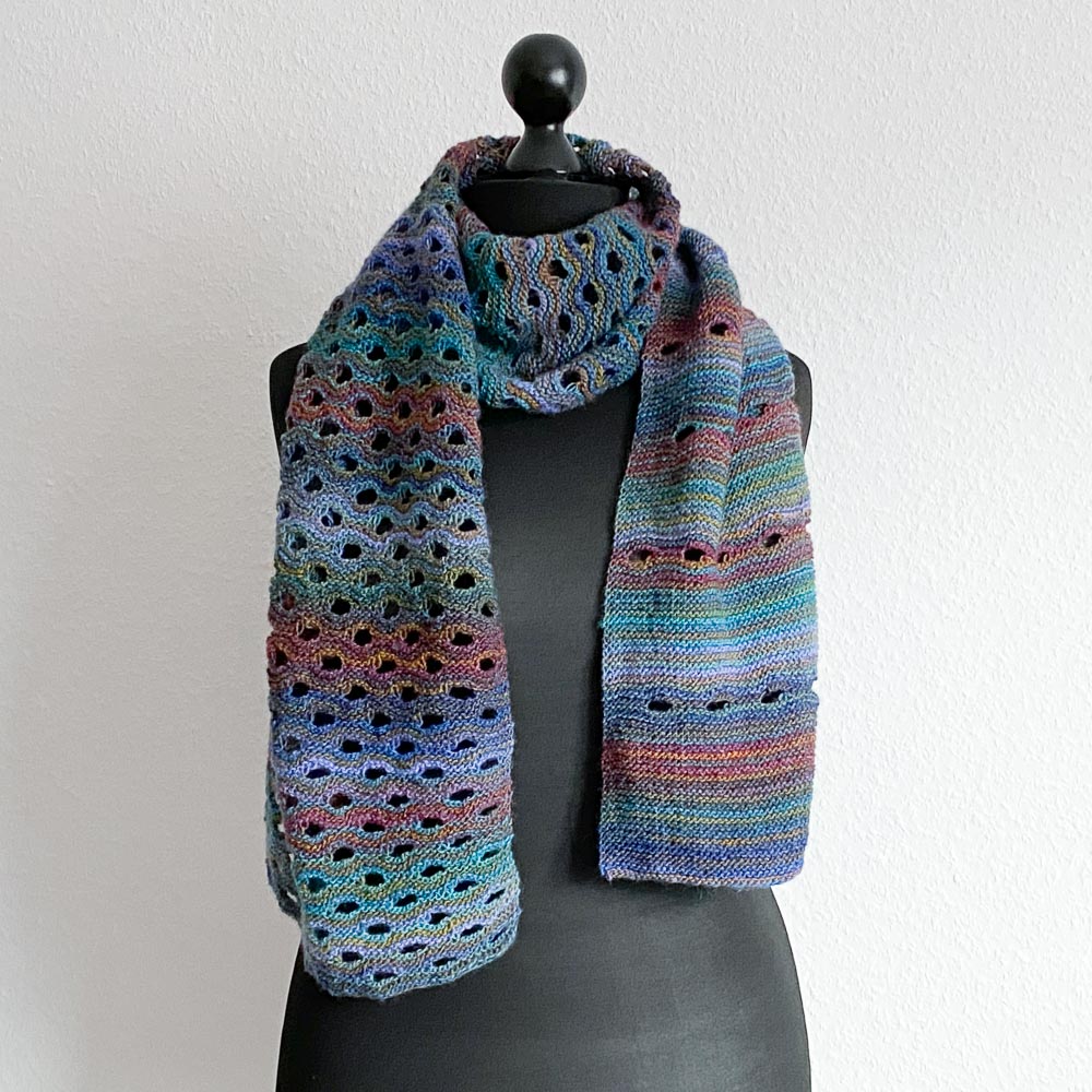 Angefangen habe ich im Januar, aber zwischendurch gab es so viel anderes zu stricken, dass der Schal ein bisschen auf meiner Fensterbank festgewachsen ist, bis ich ihn vor einigen Tagen wieder in Angriff genommen und dann auch fertig gemacht habe. Verstrickt habe ich mit Nadelstärke 3,5 280 Gramm Winter Glow von Hobbii in der Farbe Turquoise/Mustard/Khaki/Wine/Pastel Blue (21); angeschlagen hatte ich 86 Maschen. Gut die Hälfte des Schals habe ich die Löcher in gleichmäßigen Abständen gestrickt, danach bin ich dann zwischen den Lochreihen immer breiter geworden. Bis auf die Löcher ist alles kraus rechts gestrickt.