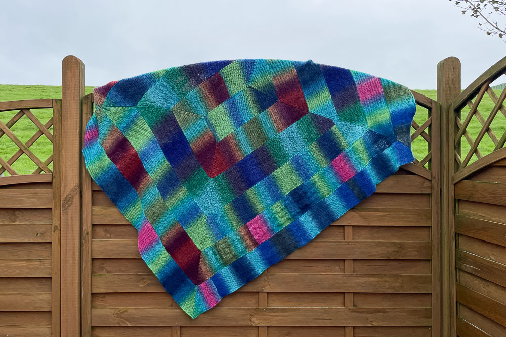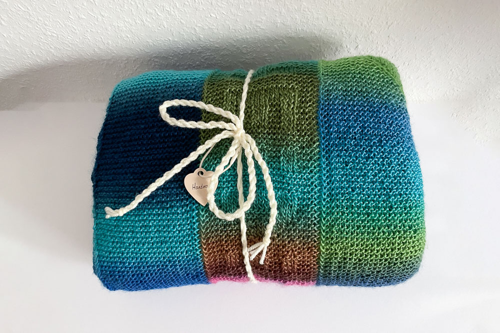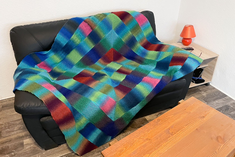 Gestrickt habe ich mit 4,5er-Nadeln mit Rainbow von supergarne.com, das ist ein reines Acrylgarn, was ich für eine Decke sehr praktisch finde. Verbraucht habe ich 1.105 Gramm, also elf Knäuel und noch drei Meter von einem zwölften Knäuel; die Decke ist ca. 150 cm x 170 cm groß. Ich habe verschiedene Farben verstrickt, nämlich alles, wo Türkis und helles Grün drin war.