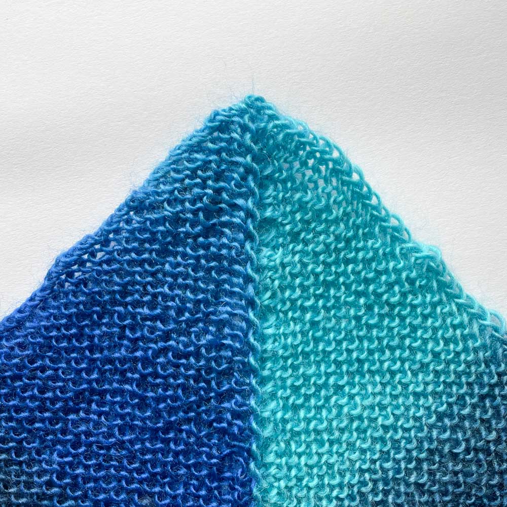 Die Außenränder habe ich mit einem Knötchenrand gestrickt, weil ich an Krausgestricktem Kettränder nicht mag. An der Ecke zur letzten Runde habe ich von Kett- auf Knötchenrand umgestellt, das sieht man auf dem Foto ganz gut. Rechts ist der Kett- und links der Knötchenrand: