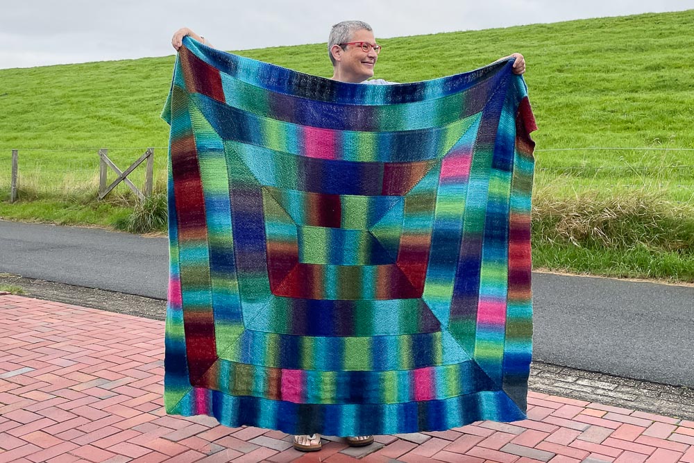 Gestrickt habe ich die Decke für eine Freundin; angefangen habe ich am 6. August und fertig war ich gestern Abend, also am 28. August. Wobei ich die 22 Tage auch mit Ausnahme von drei Tagen wirklich fast ständig gestrickt habe.